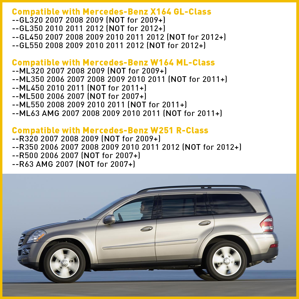 Window Switch Button Cover Cap For Mercedes-Benz X164,W164,W251 etc. Fit for: Compatible with Mercedes-Benz X164 GL-Class --GL320 2007 2008 2009(NOT for 2009+) --GL350 2010 2011 2012(NOT for 2012+) --GL450 2007 2008 2009 2010 2011 2012(NOT for 2012+) --GL550 2008 2009 2010 2011 2012(NOT for 2012+) Compatible with Mercedes-Benz W164 ML-Class --ML320 2007 2008 2009(NOT for 2009+) --ML350 2006 2007 2008 2009 2010 2011(NOT for 2011+) --ML450 2010 2011(NOT for 2011+) --ML500 2006 2007(NOT for 2007+) --ML550 2008 2009 2010 2011(NOT for 2011+) --ML63 AMG 2007 2008 2009 2010 2011(NOT for 2011+) Compatible with Mercedes-Benz W251 R-Class --R320 2007 2008 2009(NOT for 2009+) --R350 2006 2007 2008 2009 2010 2011 2012(NOT for 2012+) --R500 2006 2007(NOT for 2007+) --R63 AMG 2007(NOT for 2007+) Specifications: material: ABS color: Black Features: *High-quality ABS material, exquisite workmanship, perfect transportation and storage. *The product has undergone strict inspections before manufacturing and distribution to ensure the integrity and accuracy of the product. *Stable performance, high reliability. *100% brand new in factory original packaging. *Perfect match, easy installation. Packaging include: Window Switch Button Cover*2 On May 20, 2024 at 06:04:47 PDT, seller added the following information: On Apr 26, 2025 at 05:12:36 PDT, seller added the following information: