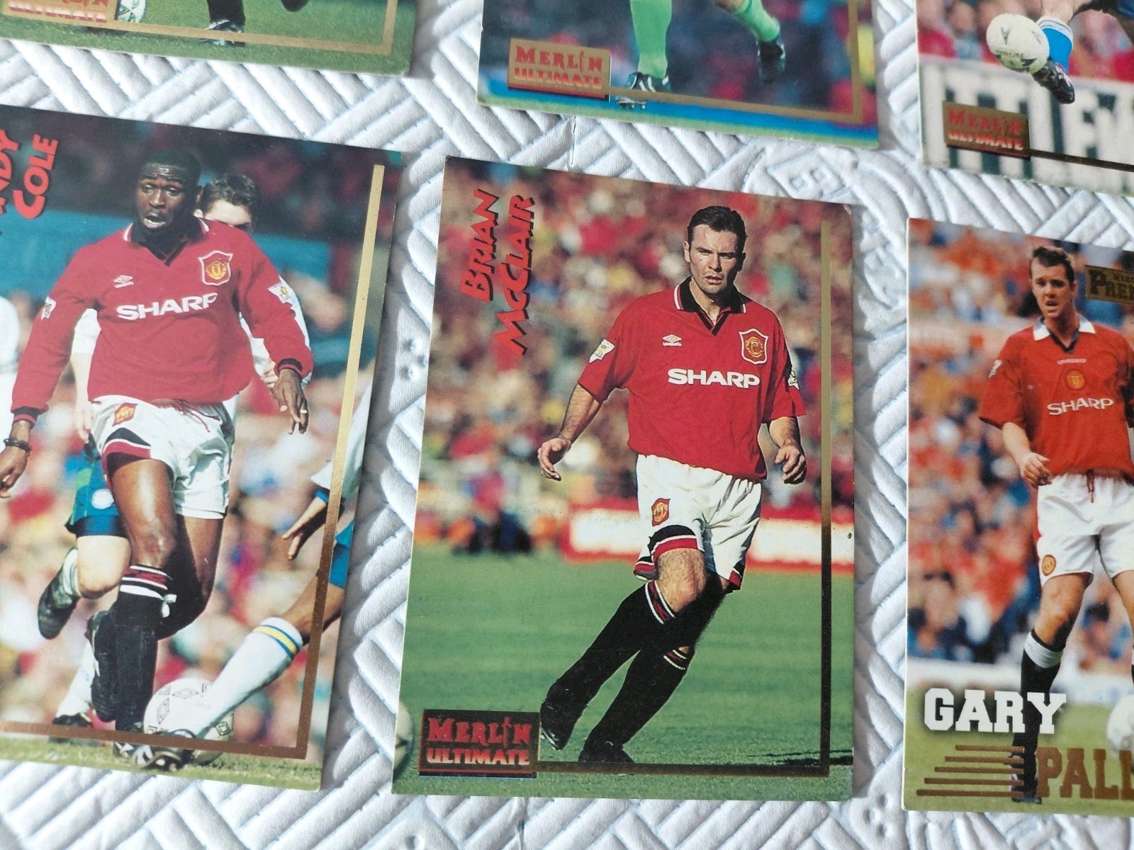 Merlin 1995 Premier league Manchester United collection cards Unuted Bundle 10 cards left to right CANTONA KEANE SCHMEICHEL GIGGS SHARPE NEVILLE COLE MCCLAIR MCALLISTER IRWIN All fantastic condition not graded. No refunds