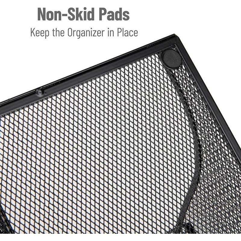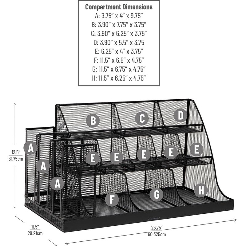 About this item Metal Multipurpose storage: Organizes cups, utensils, napkins, and office supplies in 14 accessible compartments Ideal for office breakrooms: Keeps shared spaces neat and stocked with everyday essentials Durable mesh design: Sturdy metal mesh construction stands up to frequent use in busy environments No assembly required: Arrives ready to use with non-slip rubber grips to keep it stable on any surface Dimensions: Measures 23.75 inches long x 11.5 inches wide x 12.5 inches tall (60.33 x 29.21 x 31.75 cm) and weighs 13.42 lbs (6.08 kg) › Specific Uses For Product: Coffee Bar, Kitchen, Hotel Lobbies, Breakrooms, Hospitality Suites, Restaurants, Office Receptions Material: Metal Special Feature: Condiment Organizer Color: Black Metal Brand: Finish Type: Brushed Product Dimensions: 23.75"D x 11.5"W x 12.5"H Shape: Rectangular Customer Package Type: Standard Packaging Number of Items: 1