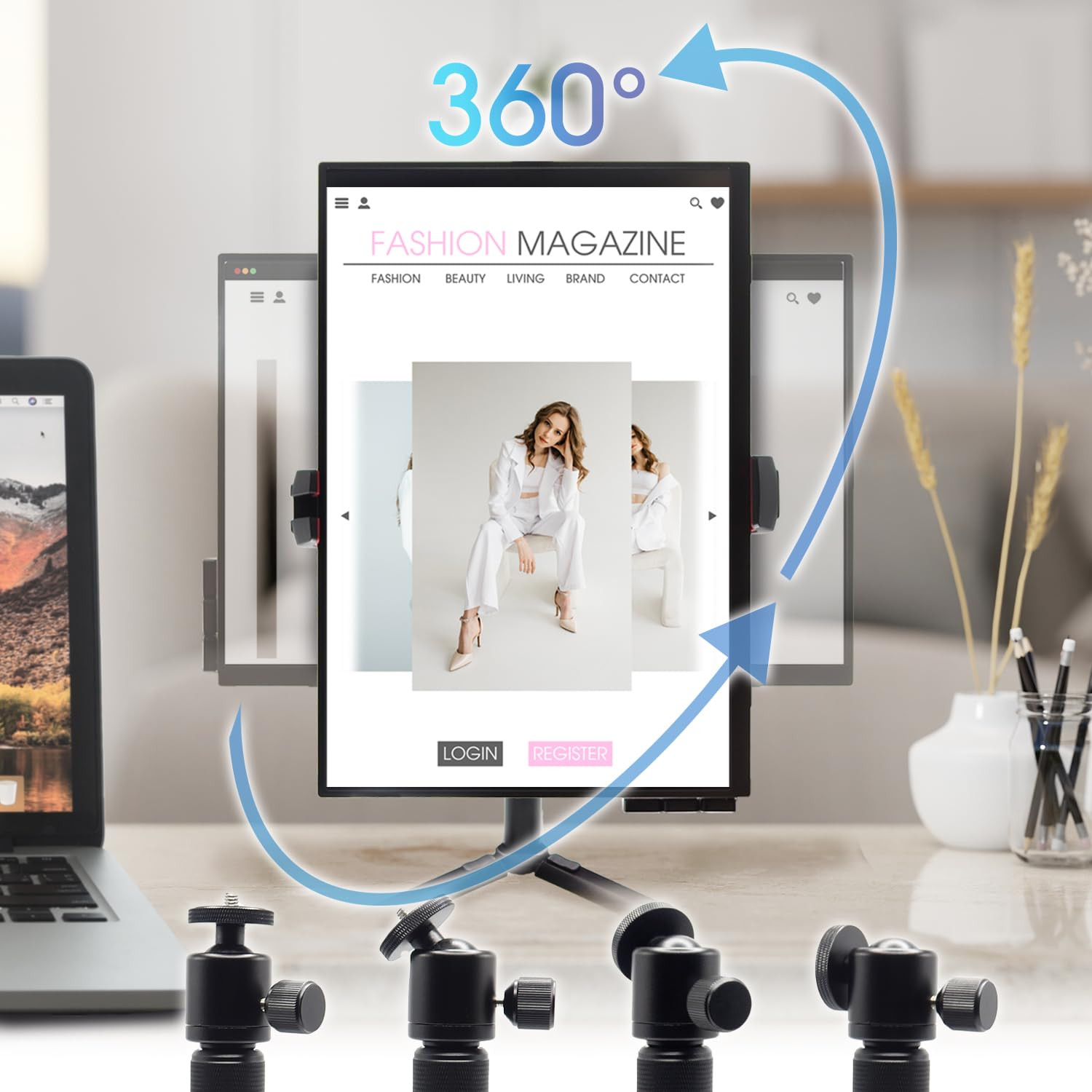 Compatibility for All - With the included 360° ball head, 1/4" screw hole to 100x100mm 75x75mm VESA bracket, as well as the tablet/phone clamp holder, this Metal Tripod Stand Set serves as you all-in-one stand solution for portable monitor, phone, tablet, projector, camera, webcam, and more. 360° Premium Ball Head - Compact size, light weight and premium build quality, the 360° ball head ensures that you always have your best shooting or viewing angle possible. Full Clamping Range - The 2-in-1 tablet/phone clamp holder features a clamping range between 2.56 inches (65mm) and 8.86 inches (225mm), fully supporting all mobile phones, tablets/portable monitors up to 14.6", and most 15.6" portable monitors in the market with slim bezel less than 8.86 inches (225mm) in height top to bottom. VESA Ready Display Device Friendly - With the included 1/4" screw hole to 100x100mm 75x75mm VESA bracket, simply mount your VESA ready portable monitors and others, and you are good to go. Ultimate Portability - The Metal Tripod Stand Set can be disassembled into several parts easily when you are on the go. Relocation of your mobile or desktop workstation made easy. Unlimited Combo Possibilities - With universal 1/4" screw size and VESA standards, you can easily combine any of the set components with your own devices to unlock unlimited possibilities.