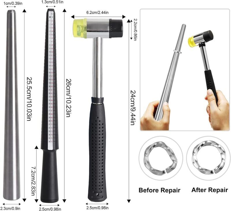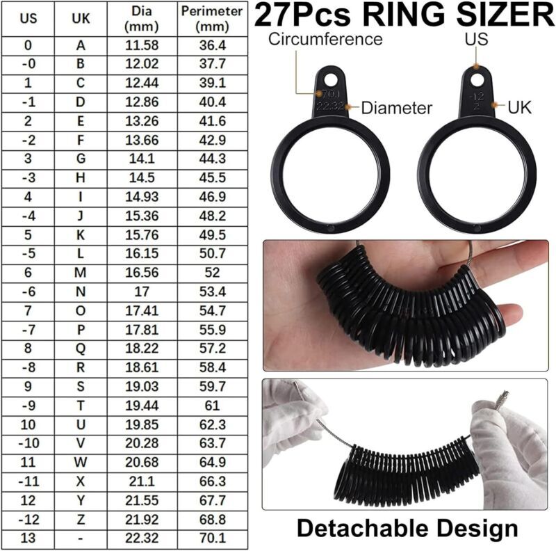 Product Description 11 Pieces US UK Ring Mandrel Set, Size 1-13 with Half Size Ring Sizer Gauge Ring Mandrel Jewelry Hammer Ring Sizer Adjuster Polishing Cloth Polishing Stick Polished Agate Knife Measuring Tool (Black) Package includes: this package contains 1 piece pf US white (1-17) ring sizer, 1 piece of UK black (A-Z) ring sizer, 1 piece of ring mandrel, 1 piece of finger sizer measuring ring tool, 1 piece of ring repair tool, 1 piece of rubber jewelry hammer, 2 pieces of polishing cloths, 2 pieces of polishing stick and 1 piece of polished agate knife, totally 11 pieces in this combination set Measure sizer: the ring mandrel with US sizes of 2-15 and UK sizes of D-Z with line marks on shaft to get the ring straight before measuring; Ring sizer gauges include 27 pieces, US ring sizes of 0-13, comes in half sizes (the negative number means half size), no quarter sizes, can easily get the accurate size of your lover Practical repair tools: the rubber hammer and wood repair tool can be applied to fix or adjust rings or other jewelry, rubber head will not leave marks on the jewelry or damage your jewelry Useful polish tools: the natural agate stone burnisher is the useful tool for metal clay work, which is designed for burnishing gold leaf and other surfaces to a high luster, agate will not mar your items Various application: ideal measurement tools can help you easily get the exact size of your lover, these jewelry making tools can be widely applied for craft wire, wire working and jewelry, convenient to operate for any DIY lovers or beginner Package Include: 1 x Ring mandrel 1 x Ring repair tool 1 x US white (1-17) ring sizer 1 x UK black (A-Z) ring sizer 1 x Finger sizer measuring ring tool 1 x Rubber jewelry hammer 2 x Polishing cloths 2 x Polishing stick 1 x Polished agate knife Widely Used in Jewelry Processing. Convenient for DIY Enthusiasts or Beginners Operation. Payment Policy Shipping Policy Returns Policy