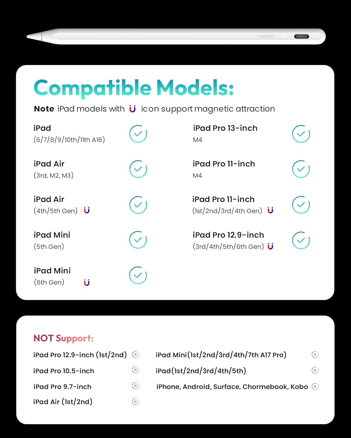 Metapen Pencil A8 for Apple iPad 2018-2025, (2X Faster Charge), Tilt White 🌟 Product Features ✨ 【0.1 mm Pixel Precise Without Delay】: The upgraded smart chip gives the pen a pixel-level accuracy of up to 0.1 mm, high sensitivity, no breakpoints and no delay. You can just enjoy writing small words and drawing fine lines with ease, just like a real pencil! NOTE: The iPad stylus does not have a pressure sensitive design ✨ 【2X Faster Charge】: Metapen Pencil A8 can be fully charged in just 30 minutes with USB-C and run for up to 10 hours. Charge 1 min = work 50 mins, charge 4 mins = work 2 hours. The LED indicator shows different colors according to the power, reminding you to charge in time. Automatic shutdown after 5 minutes of inactivity for efficient energy saving ✨ 【More Durable Tips】: Made of high quality polymer material, the Metapen‘s tips pass the 20 km tip durability test -- 2X more durable than the original iPencil's tips. Its internal structure remains always intact after 3000 times impacts. In addition, each Metapen A8 pen comes with two extra replaceable tips , much cost-saving for users with high frequency pencil tips ✨ 【Tilt-sensitive and Palm Rejection】: Different angles create different lines and shadows on screen. Tilt for the shadow in [pencil brush] or tilt for thicker lines in [Marker brush]. Our ipad stylu supports with Palm Rejection. No longer glove, you can rest your palm or fingers on the screen during sketching, drawing and writing ✨ 【Quick Connect and Double Magnets】: No need to connect to Bluetooth or APPs. Double-tap the top of the pen (Invisible touch switch) to turn it ON/OFF for a quick connect. With two built-in magnets, the Metapen iPad Pen is always ready to firmly attach to your iPad at any time, no more rolling and lost. (NOTE: Wireless Charging is NOT Supported. NO Magnet Attach for iPad Air 3rd/M2/M3 Gen, iPad 6th/7th/8th/9th/10th/11th Gen, iPad mini 5th/7th, iPad Pro M4) ✨ 【Make Sure Your iPad Model is Compatible】: Metapen Pencil A8 is ONLY compatible with the iPad 2018-2025 versions: iPad 11/10/9/8/7/6 Gen, iPad Pro 13 inch M4, iPad Pro 11 inch 1/2/3/4/M4, iPad Air 3/4/5/M2/M3, iPad Pro 12.9 inch 3/4/5/6 Gen, iPad Mini 5/6 Gen. NOTE: The Pencil A8 is NOT compatible with iPad models before 2018, iPhone, Android and Microsoft devices. Please check your product model before placing an order. ✨ 【All-powerful Assistant】: Pencil A8 uses the latest technology to accurately capture your every stroke. It is the best apple pencil for study and work, helping you to take notes, draw, sketch, design, and edit videos easily. At the same time, like the original iPencil, it can be used with iPad to achieve smart graffiti (automatically converted to regular shapes) and double-click the lock screen for quick memo. It is a good partner for children, college students, engineers, artists, and who often use iPad for digital work. 📦 Shipping: Shipping is complimentary within the lower 48 US States. 😊 🚫 We Do Not Ship to PO/APO Boxes, HI or Alaska 🌍 We Do Not Ship Outside of the Continental US ⏱ All items ship within 24-72 hours of Payment 📞 For large items that require Freight shipping, a valid phone number is required to call and schedule your delivery 📜 Terms of Sale and Feedback: ⭐ Feedback is extremely important to us and eBay 👍 If you are satisfied with our transaction, please take a moment to leave Positive Feedback. YOUR Satisfaction is our #1 Priority! ⚠ If there are any issues, PLEASE contact us BEFORE leaving a neutral or negative rating so that we may resolve any concerns. 💖 We PROMISE we can make you happy if you give us a fair chance. 🔃 Returns / Concerns: 📅 All items qualify for returns within 14 - 30 days of receipt. Buyer is responsible for return shipping on any item that is not damaged. 🛒 Please be sure this is an item you want before making your purchase. Customer Satisfaction is our TOP priority! 📦 All items are IN STOCK at time of listing. 📊 Inventory on eBay changes constantly and it is impossible to maintain a perfectly accurate count of all items. 🙋♀️ Please do not penalize us if we have to issue you a refund! 🙌 Thank You For Your Business!