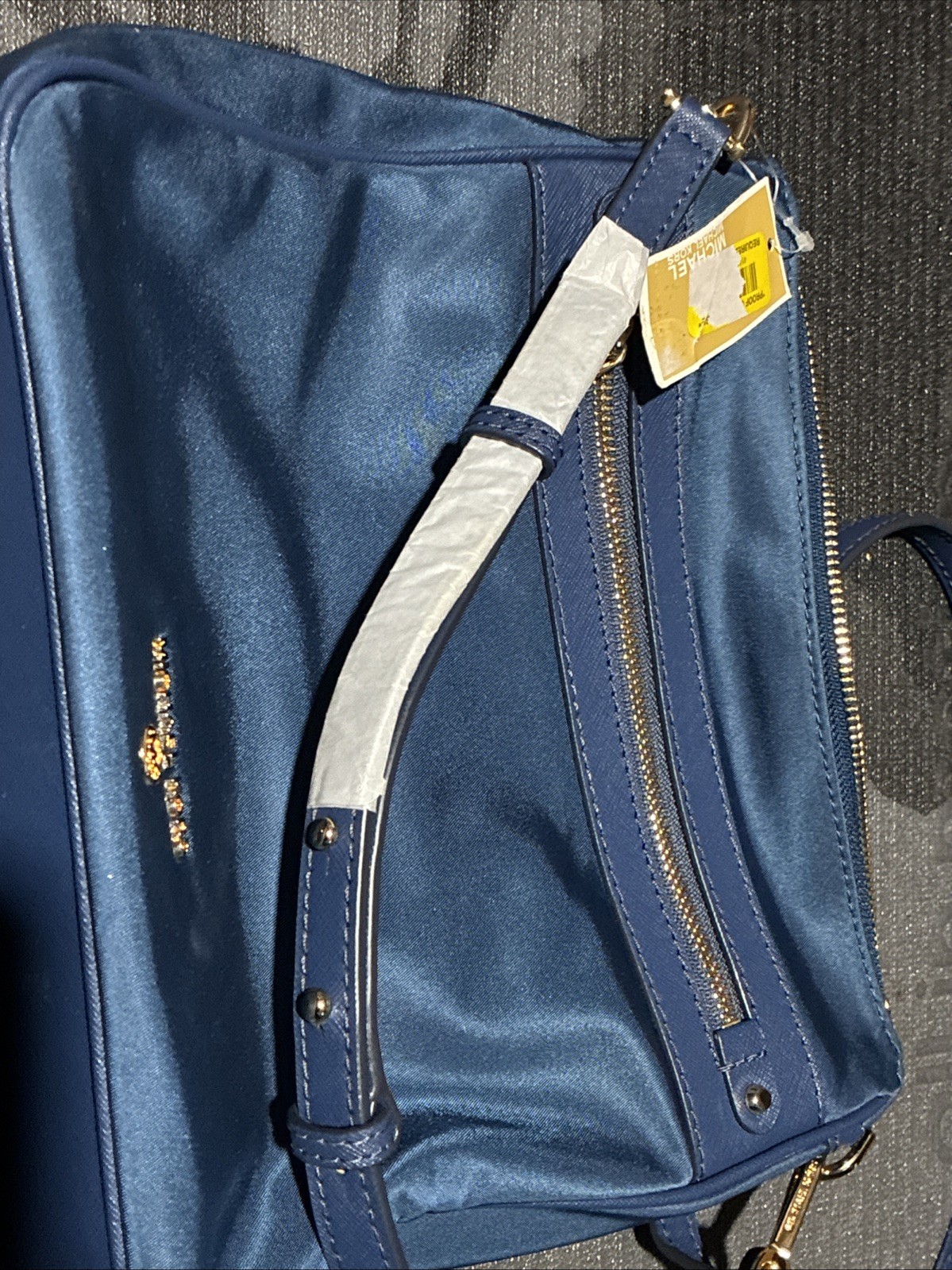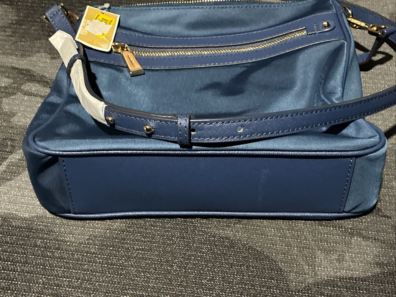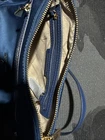 The Michael Kors Blue Nylon Crossbody Bag is a stylish and practical accessory for women. This medium-sized bag features a solid navy blue exterior made of durable nylon, with a zippered closure and gold hardware accents. The navy blue handle/strap adds a touch of elegance, while the beige fabric lining provides a clean and versatile interior. Perfect for carrying essentials while on the go, this crossbody bag is a fashionable and functional addition to any outfit.