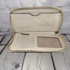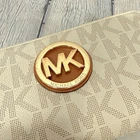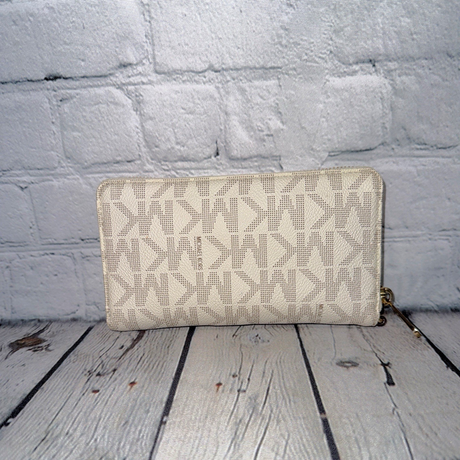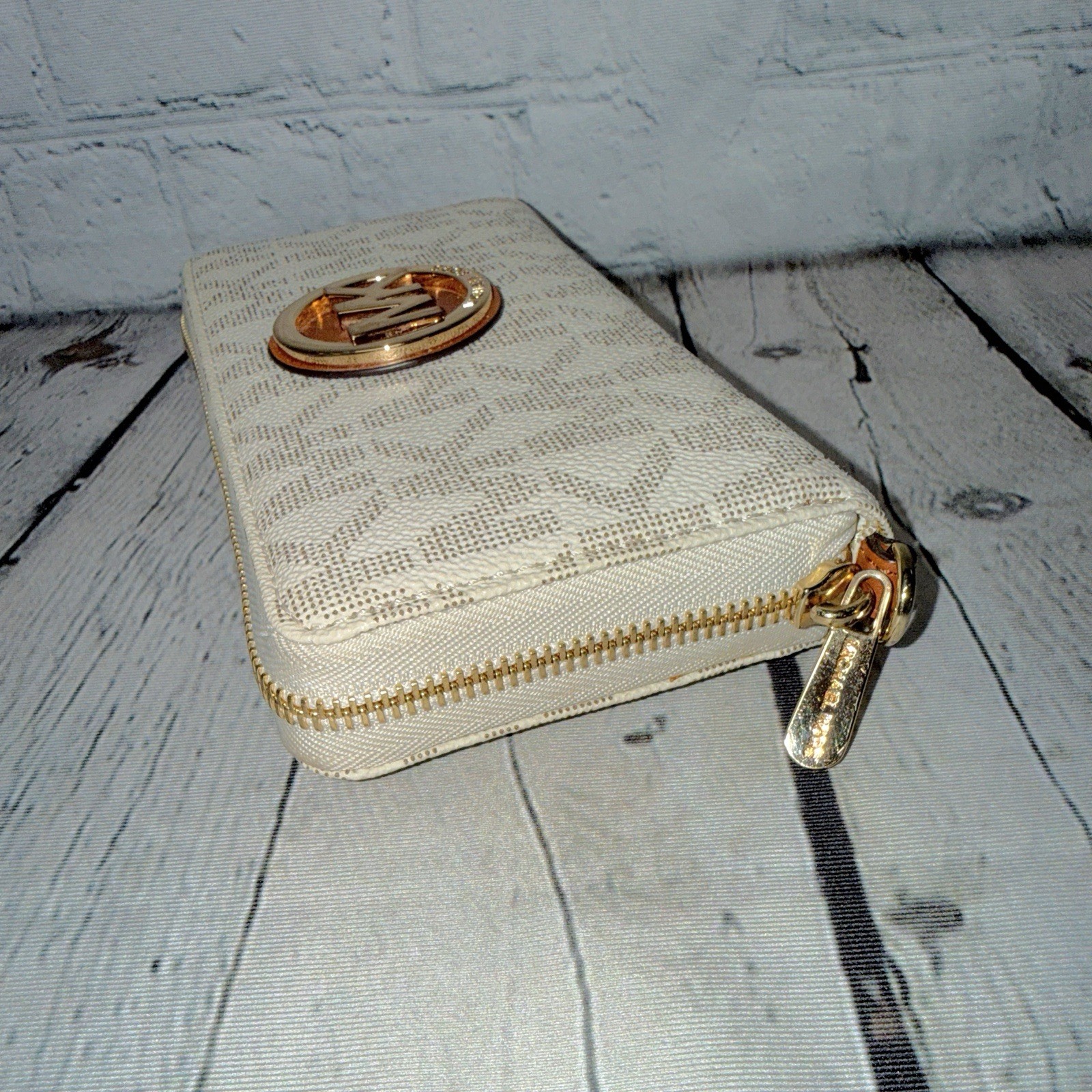 Michael Kors Fulton Wallet in cream & brown monogrammed leather. Gold tone hardware. Tan leather + gold brand plate on front. 3-side zip around close. Inside includes multiple cards slots, a clear ID slot, zip change pocket, multiple storage slots, & a phone holder on the other side. 7.25” x 4” x 1.5”D Used once- EUC!