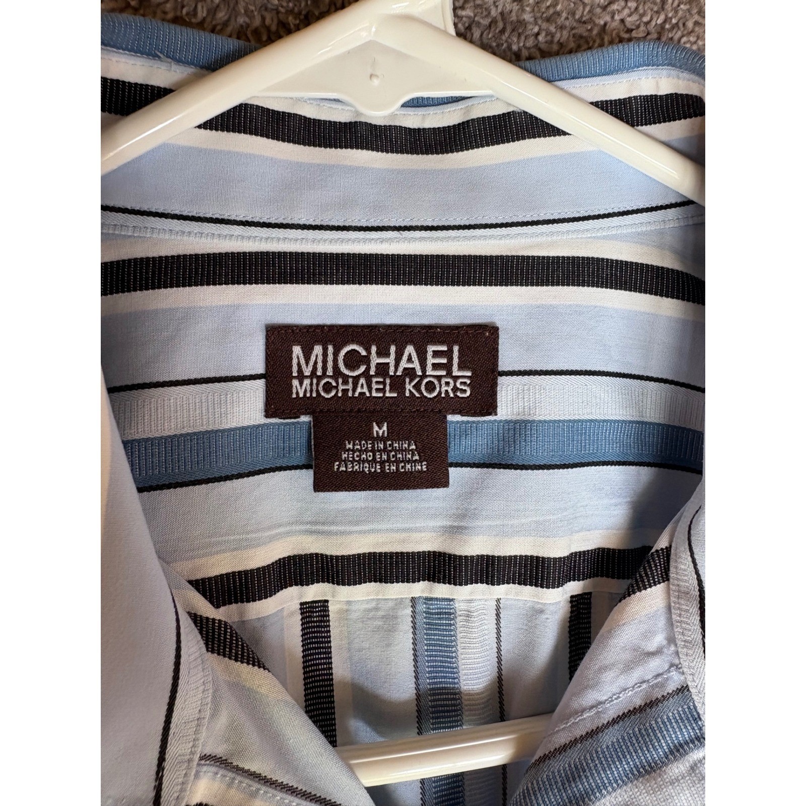 A classic men's long-sleeved button-down shirt in a refined stripe pattern. This collared shirt offers a sharp and sophisticated look. Its versatile design makes it an excellent choice for a business casual office environment, a smart dinner outing, or as a stylish addition to a weekend ensemble. Department: Men Sleeve Length: Long Sleeve Pattern: Striped Type: Dress Shirt Collar Style: Button-Down Material: Cotton Blend Top Cuff Style: Barrel Cuff Neckline: Collared Length: 27" Pit-to-Pit: 21" Keywords: Michael Kors shirt, Men's dress shirt, Striped button down, Long sleeve shirt, Men's fashion, Business casual, Smart casual wear, Designer shirt, Blue and black stripes, Menswear, Collared shirt, Office attire, Weekend style, Fashionable shirt