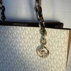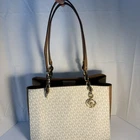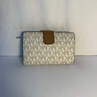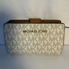 Michael Kors Sofia Medium Signature Tote Handbag Details: Brand: Michael Kors Style: Tote bag Material: It is made of vanilla and acorn signature-print coated canvas with gold-tone hardware. Measuring: 12.5" W, 10" H, 5.5" D, Double Straps with 11" Drop Design: The bag features double top handles with chain-link details, a magnetic snap closure, and a spacious interior often organized with a middle zip compartment. A prominent gold "MK" logo charm hangs from one of the handles. Michael Kors Outlet Medium Signature Logo Wallet Details: Material: It is made of vanilla and acorn signature-print coated canvas with gold-tone hardware. Measuring: 5.25” W, 3.5” H, 1.5” D Design: Bi-fold wallet with compartments for cards, cash and coin. Both items are Pre-Owned In Excellent Condition. See pictures for more details Stylish and versatile Michael Kors tote bag in a rich vanilla and acorn color. Perfect for everyday use with ample space for all your essentials.