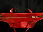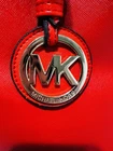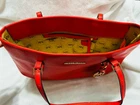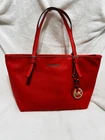 This Michael Kors Jet Set travel tote is a stylish and practical option for any woman on the go. The radiant orange exterior is made of high-quality saffiano leather and features a gold-plated hardware. The bag has a zip closure and double handles, with a 9.25" drop for comfortable carrying.The tote has a solid pattern and features a Michael Kors logo accent. It has inner pockets for added organization and is stain-resistant, making it perfect for travel. The bag also comes with a bag charm accessory and has a medium size, measuring 15" in width, 11" in height, and 6" in depth. This classic piece is a must-have for any fashion-savvy woman.