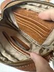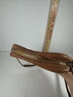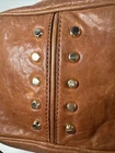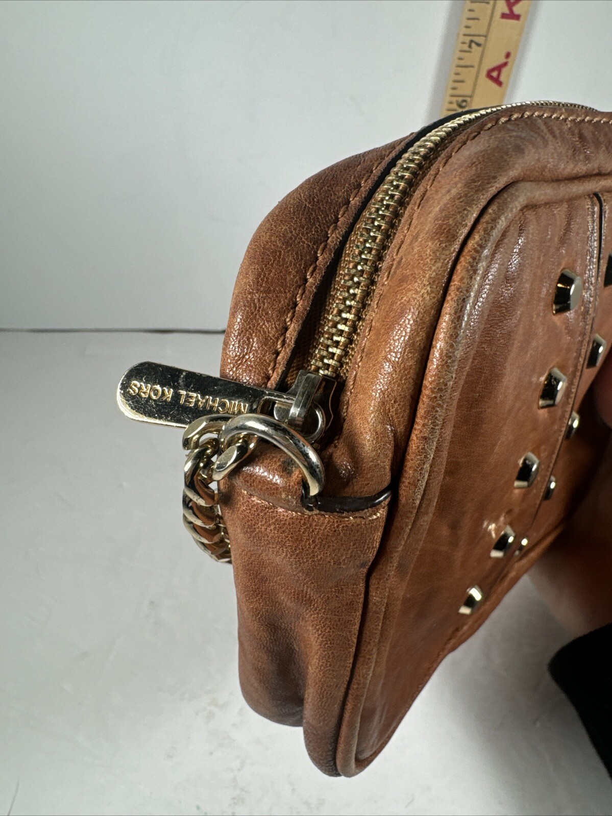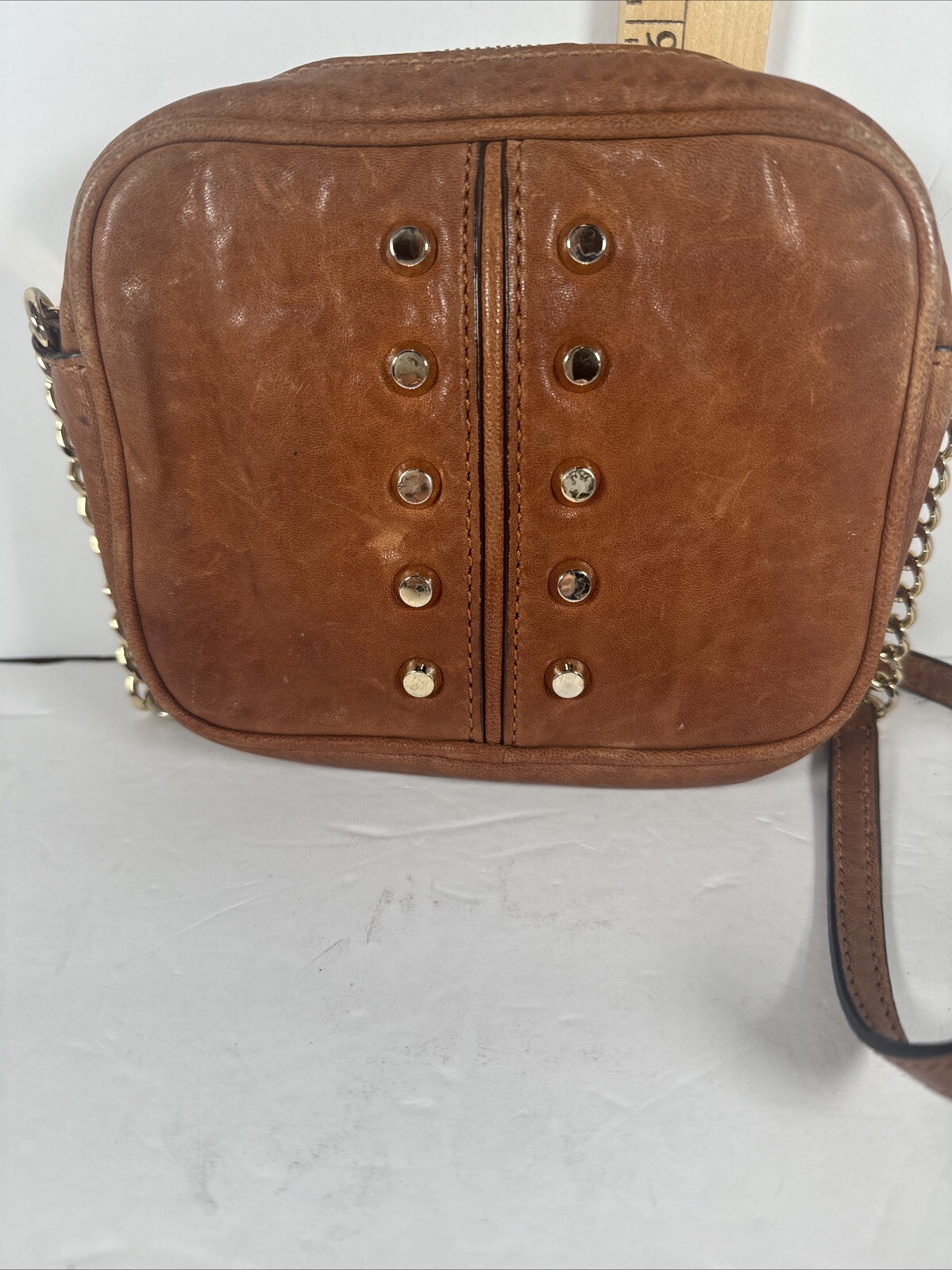 Elevate your style with this chic Michael Kohrs Leather and Chain Studded Crossbody. This small-sized bag is perfect for a day out or a night on the town. The bag is made of high-quality leather and features a zip closure, brown leather handles/straps, and gold hardware. The interior of the bag is lined with beige fabric and features a studded accent that adds a touch of elegance to the overall design. This crossbody bag is perfect for women who want to make a fashion statement while keeping their hands free. Whether you're going out with friends or running errands, this Michael Kohrs Leather and Chain Studded Crossbody is the perfect accessory to complete your outfit.