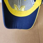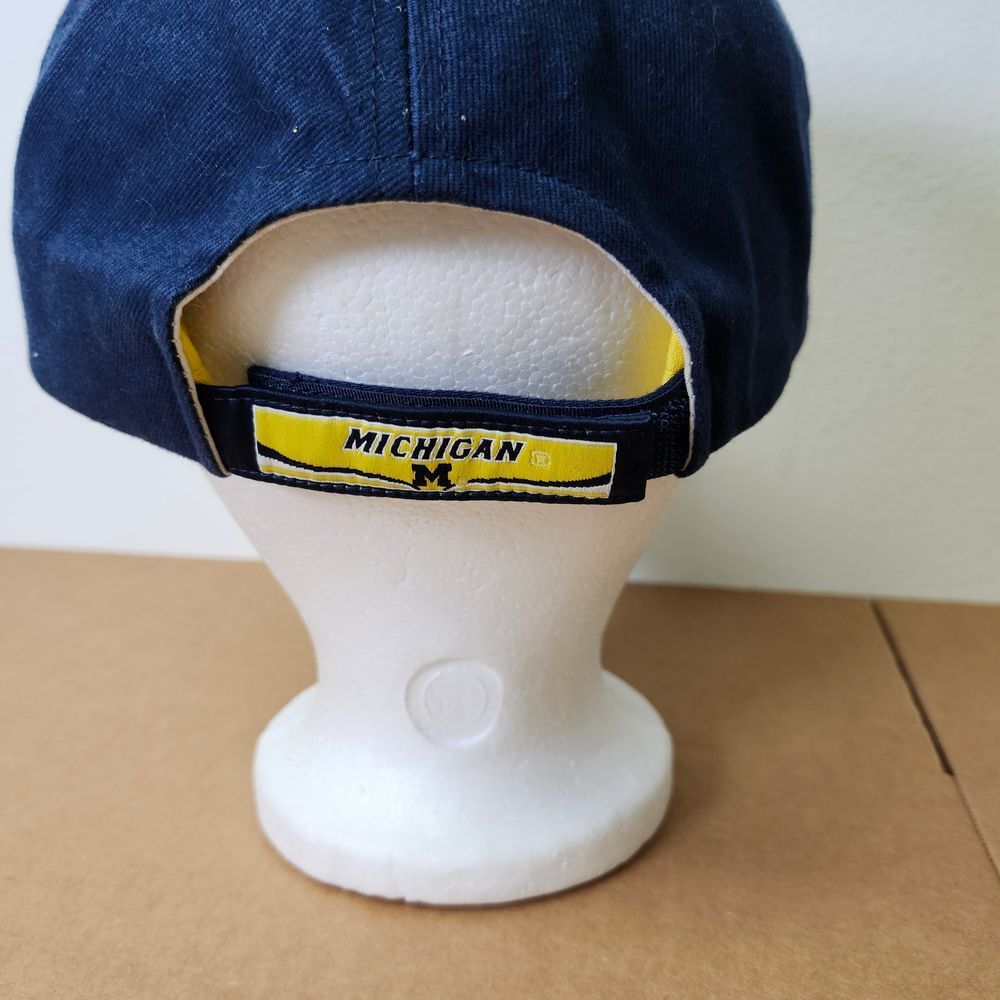 Official University of Michigan baseball cap in navy blue with yellow 'M' logo. Features curved brim, embroidered team details, and contrasting yellow/white side design. Cap shows minimal wear and maintains shape well. Adjustable fit with snap closure. Keywords: michigan wolverines, university of michigan, college baseball cap, ncaa merchandise, michigan hat, wolverines fan gear, sports cap, navy blue hat, team merchandise, athletic wear, university apparel, michigan athletics all items have been cleaned and disinfected we stand behind all we sell so please contact us if you have an issue with any order