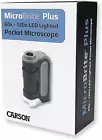 Microbrite plus 60X-120X LED Lighted Pocket Microscope, Portable Handheld Micros Pocket Microscope – The MicroBrite Plus LED Pocket Microscope is compact and lightweight, making it the perfect educational toy for portable use as a field microscope or classrom lab microscope. Educational Toy – Add this STEM toy to any classroom science kit to bring educational content to life. The MicroBrite encourages hands-on exploration and a deeper understanding of the natural world Bright LED Illumination – The built-in advanced light system of this pocket microscope evenly shines bright LED light onto specimen to provide clear vision and accurate observations. High Magnification – With a versatile magnification range of 60x to 120x, the MicroBrite can adapt to any experiment, providing stunning accuracy and precision when viewing prepared microscope slides or everyday objects under the microscope. Designed and Lab Tested in New York by Carson, USA Optics Experts Since 1990. Product Description Our Story The video showcases the product in use. The video guides you through product setup. The video compares multiple products. The video shows the product being unpacked. With over 30 years of experience in the optics industry, Carson’s product line has grown exponentially to encompass a wide range of products and accessories that reflect the needs of its customers. Carson has a dedicated team of engineers whose sole mission is to improve the customer experience. Carson MicroBrite Plus Pocket Microscope! The video showcases the product in use. The video guides you through product setup. The video compares multiple products. The video shows the product being unpacked. Discover, learn, and explore the wonders of the natural world with the Carson MicroBrite Plus LED Lit Pocket Microscope! With up to 120x magnification and LED lighting, kids, adults, students and professionals alike can witness the tiniest details come to life in this powerful portable tool. 60x - 120x Pocket Microscope MicroBrite Plus Handheld and Portable LED Lit for Bright & Clear Images Lab Tested Magnification Our team of Engineers personally test each and every one of our optical products for 100% magnification accuracy. Don't be fooled by what you see! LED Lighting Reveal all the hidden details with our advanced LED lighting system! Built in bright LED lights help you observe clear, detailed images with ease. 60x - 120x Zoom Magnification With a versatile magnification range, the MicroBrite adapts to your needs with precision. Adjust the zoom of your MicroBrite for stunning accuracy! For Best Results... Microscope Base must be flush against a flat viewing surface, with the LED Light turned on to provide the highest clarity images in your studies. MicroBrite Plus Other Carson Microscopes! 60x - 120x Magnification Range 60x - 120x Slides Included Phone Clip Included Additional UV Light See Everyday Objects See Slides LED Lighting 60x - 120x Magnification Range 100x - 250x Slides Included Phone Clip Included Additional UV Light See Everyday Objects See Slides LED Lighting 60x - 120x Magnification Range 100x - 250x Slides Included Phone Clip Included Additional UV Light See Everyday Objects See Slides LED Lighting 60x - 120x Magnification Range 20x - 60x Slides Included Phone Clip Included Additional UV Light See Everyday Objects See Slides LED Lighting MicroBrite Pro MicroFlip MicroFlip Bundle PocketMicro Does this pocket microscope work on 3D (not flat) objects? YES, but practice focusing and examining flat objects first. A 3D object will work if placed near (but not inside) the bottom of microscope (clear part), but if you pre-focus the microscope on a flat object first, it will be much easier. I'm looking at an object like a stamp and image is upside down / reversed. Is that right? YES, most microscopes do this. For handheld microscopes, the optical system flips and reverses the image, while magnifying it. This allows for an affordable and compact design. The microscope isn't broken, that's just how a pocket microscope works What kind of things can I review with this microscope? The MicroBrite can examine a diverse range of subjects, such as fabric, grass, sand, hair, skin, bugs, stamps or even a pineapple or worm! You can even observe larger microorganisms like bacteria, blood, germs, paramecium and euglena! Can I use a smartphone with this microscope to take images and video? The MM-300 version does not have a smartphone adapter, but you can buy the MM-310 adapter separate to work with it OR you can buy the MM-350 that comes with both the microscope and the smartphone adapter. How do I get the best image when focusing with this portable microscope? Always practice focusing on a flat object at the lowest power setting. Slowly turn the knob until you get close to seeing a focused image. Then turn the knob extremely slowly to get the perfect focus. Then up the power setting and slightly refocus. Item model number MM-300 Light Source Type LED Style MicroBrite (MM-300) Language English Color Black/gray Product Dimensions 2.25"L x 1.2"W x 3.5"H Material Plastic Country of Origin China Compatible Devices Smartphone Item Weight 2.08 ounces Batteries 1 AA batteries required. Voltage 1.5 Volts Model Name MM-300 Magnification Maximum 120 x Manufacturer Optical, Inc Is Discontinued By Manufacturer No Size 1 Brand Unbranded Shipping Fast shipping USA Shipping We offer FREE shipping on all orders! Under normal circumstances, we try to ship all orders within three business days of payment, normally sooner. We use a selection of shipping services such as UPS, FedEx, USPS, etc We only ship to the lower 48 states, we do not ship to Alaska/Hawaii, US Protectorates, Puerto Rico, and PO Boxes. Local pickups and combined shipping options are not available at this time. Returns and payment Although we strive for 100% order fulfillment accuracy, mistakes happen. Please allow us to correct any error before leaving us negative feedback. We are confi