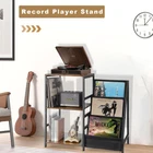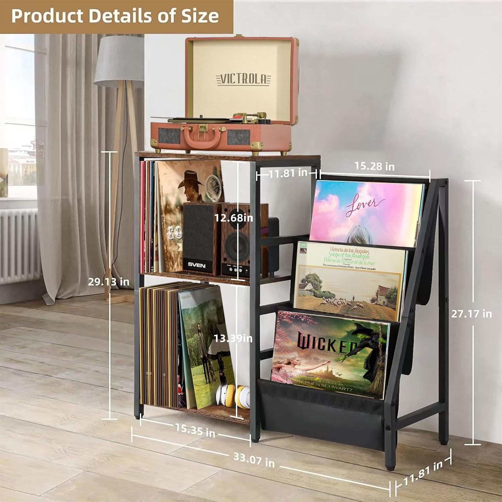 All-In-One Turntable Stand With Vinyl Record Storage Display It's made of hard wooden board, thicker iron, soft oxford fabric and adjustable feet. We adopt the high-quality material, which is friendly touch, durable and sturdy. Everything is well-packed, no need to buy more tools. It's very easy to put together. All the parts are labeled with lettered stickers making them easy to identify. Multi-Functional 3-Tier Storage Solution: This record player cabinet and record player stand features three spacious tiers designed for versatile use. The top tier securely holds most turntable systems (compatible with all major brands), while the middle and bottom tiers organize vinyl records, speakers, books, and collectibles. Enhanced with a side 3-tier vinyl display, it doubles as record holder stand, CD organizer, retro home decor piece, or vinyl table, offering 200+ album storage capacity Sturdy Record Player Stand | Premium Stability & Durability : Crafted with rich walnut vinyl shelf panels and a reinforced metal frame, this record shelf ensures lasting sturdiness. Soft oxford fabric protects surfaces, while adjustable feet and dual-side ladder structures prevent shaking, making it a reliable record holder stand even for heavy vinyl record player stand setups (31.69"L x 29.13"H x 11.81"W) Versatile Retro-Modern Aesthetic: Beyond serving as a record player stand with vinyl storage, its mid-century wood texture blends seamlessly as a bedroom nightstand or living room end table. The matte black metal and fabric accents add modern simplicity, perfect for displaying vinyl records holder collections or enhancing retro home decor Effortless Assembly & Customization: Includes numbered parts and clear instructions for quick setup of this record player holder. Choose left/right side placement to fit compact spaces. Pre-drilled holes and labeled tools ensure short, hassle-free assembly of your turntable stand with record storage Space-Saving Vintage Design At 29" compact height, this record player stand and record player table seamlessly fits beside sofas or beds. The vertical storage tiers with dedicated vinyl record holder compartments optimize space efficiency, while the timeless walnut-and-metal material contrast elevates any room’s mid-century aesthetic. If you have any questions about our product, please feel free to reach out. We will always try best to serve our customers