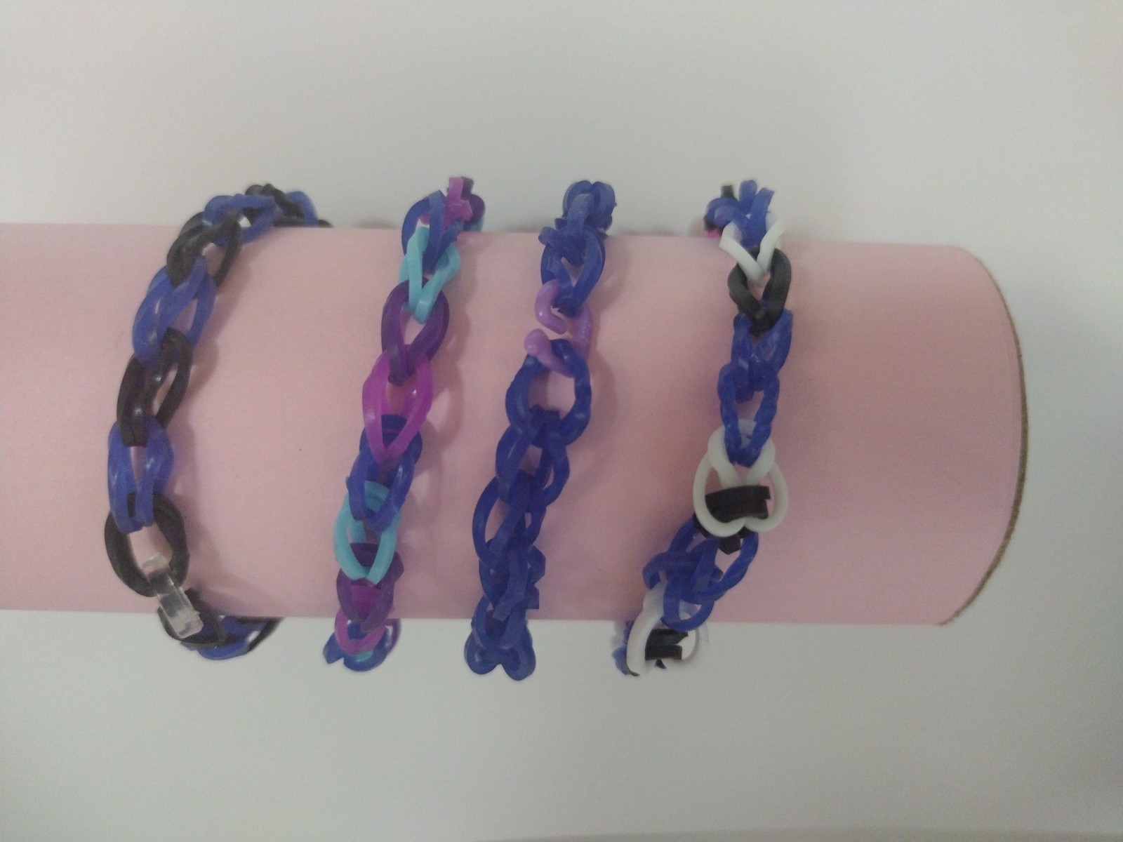 The Midnight Bundle Loom Bracelet set includes 4 multicolored bracelets made of rubber. These handmade bracelets feature bead charms and are perfect for adding a pop of color to any outfit. Made in the United States, these loom bracelets are a stylish and unique accessory for any jewelry collection. This size is for children! but they do stretch.