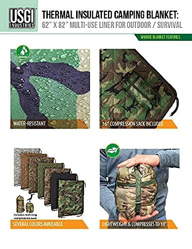 MULTI-USE PONCHO LINER: This essential piece of military survival gear provides warmth and insulation against most weather elements and temperature protection which make for the ultimate camping and outdoor blanket. Camo Pattern is one-sided MILITARY STYLE CONSTRUCTION: Tightly woven nylon fabric insulated with quick-dry polyester batting is reinforced with wave-pattern insulating quilting. Features 8 pairs of tie cords attached around edges with reinforced bar-tack stitching MEASUREMENTS: This Poncho Liner is approximately 62 by 82 inches total length and weighs 1.75 pounds with compression sack. Includes military-issue style Compression Stuff Sack which reduces space and volume VERSATILITY: Use as a quick-dry beach blanket, stadium blanket, make-shift survival shelter, sun canopy, hammock insulator, pillow, tent divider, privacy screen, emergency carry litter, seat cover, pet bed, disaster relief, concealment blind, carry satchel, backpacking blanket, sleeping bag or tent insulator, and much more : Pair it with Rain Poncho and Camp Shield/Adventure Blanket for the complete set. is a disabled veteran-owned brand. All products are designed, packaged, and distributed in the USA. Portions of every sale are donated in support of disabled veteran and first responder organizations