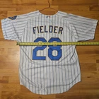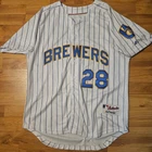 This is a Milwaukee Brewers Majestic Fielder Jersey, a replica of the uniform worn by Prince Fielder during his time with the team in Major League Baseball. The jersey is a size 48 and features a white color scheme, perfect for showing support for the Milwaukee Brewers. This officially licensed product is ideal for fans looking to represent their favorite team and player on and off the field.