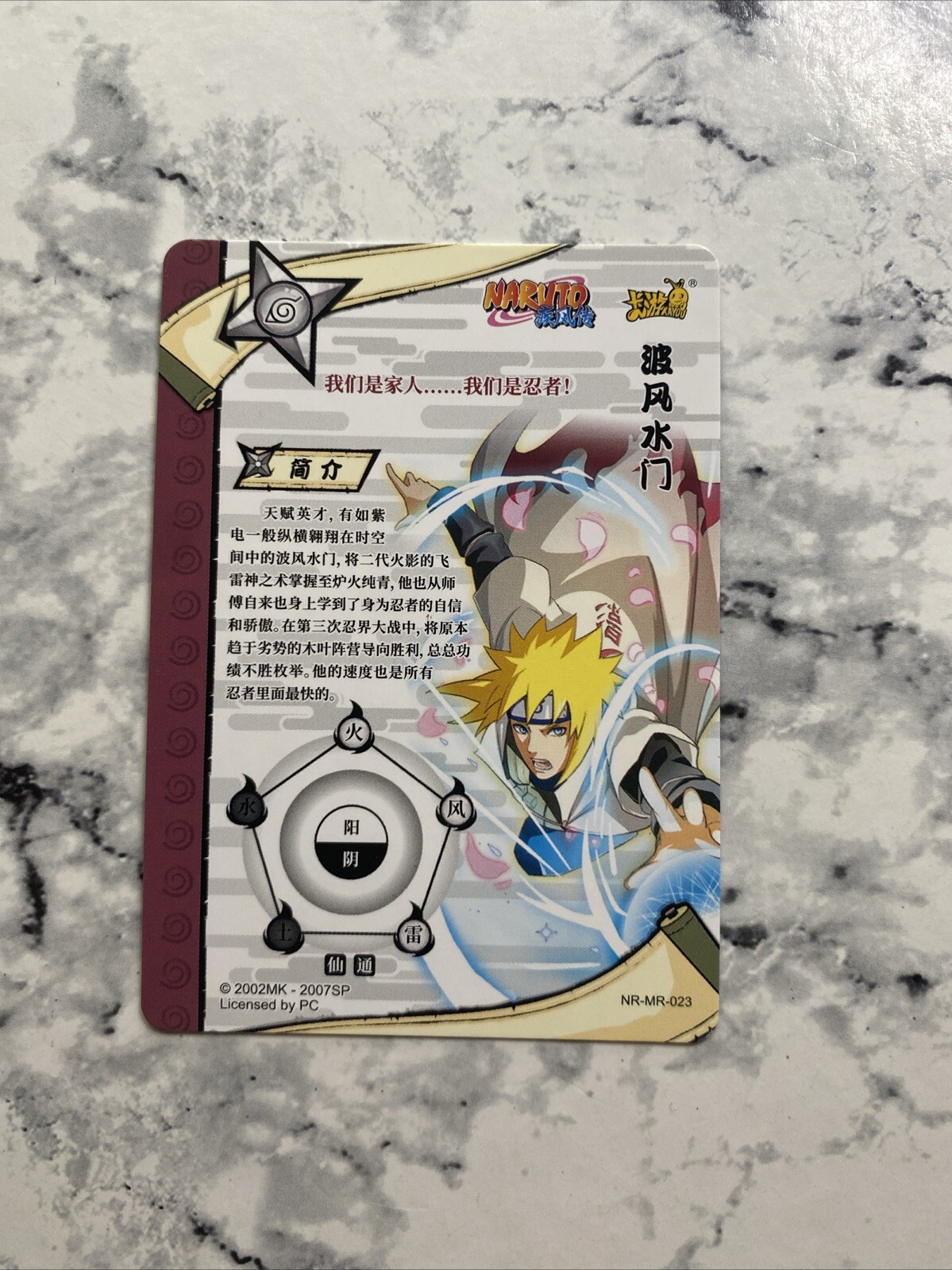 This is a rare and highly sought-after Minato MR Ultra Rare Foil Kayou Official Naruto Card TCG NR-MR-023, perfect for any collector or player of the Naruto Collectible Card Game. The card features a stunning foil finish, highlighting its intricate details and making it a valuable addition to any collection. With its rarity and importance in the Naruto CCG universe, this card is a must-have for anyone looking to complete their collection or enhance their gameplay. Don't miss your chance to own this rare piece of Naruto memorabilia.