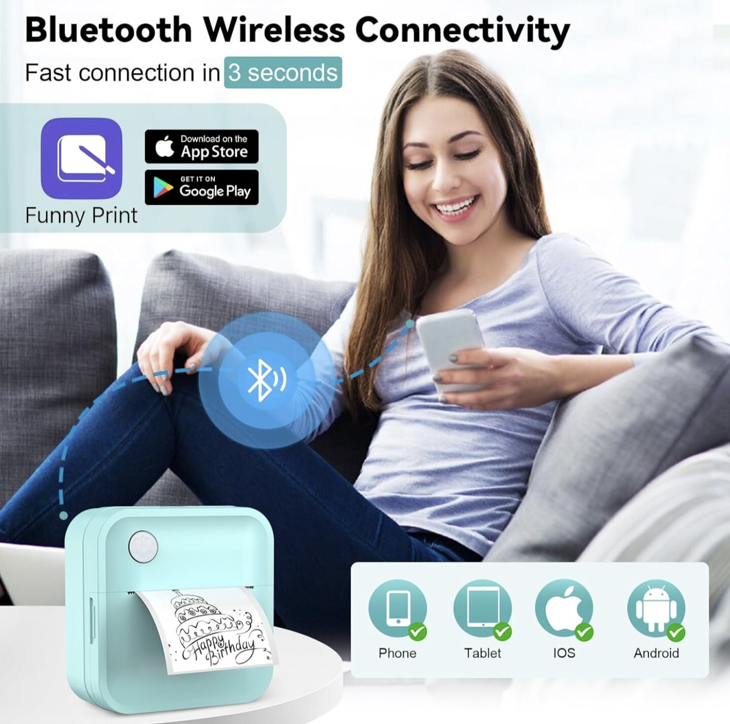 2 in1 Portable Thermal Printers - The label maker experience 203dpi high-resolution printing that supports both photo and label printing, this thermal printer also features a “Text Scaning” function which is perfect for printing study materials and scrapbook supplies. It's ideal for printing pictures, photos, stickers, memos, shopping lists, study notes, meeting records, craft teaching aids, business and work plans, office aids, messages, lists and more. Flexible Label Paper Support - The Label Printer accommodates 12mm to 50mm wide label papers, ensuring compatibility with a wide range of labeling tasks from small tags to pictures. The portable printer come with 2 rolls adhesive printing paper(1*50mmx15mm label paper, 1* 50mmx3.5M Continuous Waterproof Label) resistant to water, oil, and scratches, ensuring longevity and durability for your prints in various environments. Funny Print App with Multiple Templates -Compatibility with iOS & Android systems, this Mini Printer's printing app can be easily downloaded onto your iPhone from Apple App Store and Google Play Store. Explore a variety of templates through the “Funny Print app”, it can print barcodes, QR codes, images, photos, documents, and labels. Bluetooth Wireless Connectivity - The sticker printer connect effortlessly to your phone/tablet via Bluetooth, enabling wireless printing from anywhere, anytime. Our sticker maker suitable for all users including preschool kids, students, office worker, merchant and housewife. Ideal back to school gifts for teacher and students. Long-lasting Battery & Portable Design - Thermal label printer equipped with a 1200mAh battery, offering longer usage up to 1 week. Type-C fast charging capability ensures quick and convenient recharging. It's weighing only 140g and with a compact design, this bluetooth label maker is easy to carry wherever you go, ideal for travel and business trip. ATTN: Before using this label maker, you should fully charge it, then unplug the charger from the printer. If not unplug the charger, the printer can't be turned on and work normally. Open box