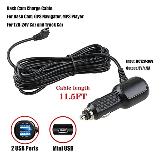 Return Policy Fast Delivery Trusted seller Dash Cam Charger Cable, GPS Navigator Charger Cable for Mini USB Port, 2 USB Ports, Mini USB Right Port Dash Charge Cable for 12V Car and 24V Truck Power Adapter Cable (Right-90 Degree Port) Product Description 【Dash Cam Charger Cable】This dash cam car charger set includ: 1 x Dash cam cable charger, 1 x Back-up fuses. The length of the power cord: 11.5 ft (3.5m). 【Garmin GPS Charger Cable】This car GPS navigator charger is a mini USB 90 degree right adapter. Mini USB car power cord is compatible with any type of car, truck,,and fits for Dash Cam, GPS navigator, MP3 Player, Digital Camera, Game console, etc. 【2 USB ports】 Dash cam charger built-in 2 USB ports, can be used to charge cell phones. 【5v 2A Power Adapter】The blue LED indicator will help you easily find the car adapter in the dark. 【Cable for Car Dash Camera】This mini USB car dash cam charger cable is suitable for most dashboards, GPS navigators (cars and trucks with voltage between 12V-24V) Shipping Returns Payment Shipping Shipping is FREE to all addresses other than APO/PO boxes in the lower 48 states. All our stock ships from US-based warehouses. Shipped via USPS or UPS (depending on location and package weight) Unless stated otherwise, all orders will ship within 24-72 hours of your payment being processed. Check our feedback to see the great reviews of FAST shipping we offer. Returns Seller does not accept returns Payment We currently accept payment via eBay managed payments only. Once payment is cleared, we will dispatch your shipment within 1-3 business days. Please refer to the "Shipping" tab for more information regarding shipping speed to your destination.