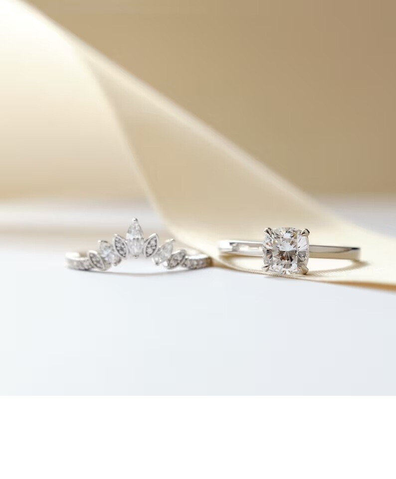 Cushion Cut Tiara Wedding Band Set, Minimalist Silver Bridal Ring Set For Women ✤ Product Details : ♦ Metal : 925 Sterling Silver ✤ Stone Details : ♦ Stone Type : Cubic Zirconia (CZ) ♦ Diamond Color : Colourless ♦ Diamond Clarity : VVS1 ♦ Diamond Shape : Cushion Cut, Marquise Cut And Round Cut ♦ Center Stone carat Weight : 1.50 CT ♦ Total Carat Weight : 1.97 CT ✤ Moissanite Stone Details : ♦ Stone Type : Moissanite ♦ Diamond Color : Colourless ♦ Diamond Clarity : VVS1 ♦ Diamond Shape : Cushion Cut, Marquise Cut And Round Cut ♦ Center Stone carat Weight : 1.50 CT ♦ Total Carat Weight : 1.97 CT ✤ Ring Size Note : ♦ Ring Size : 3, 4 , 5 , 6 , 7 , 8 , 9, 10 , 11, 12 (Quarter, Half and three quarter Size Available) Note : Please send us the requested ring size in a message or in the "Buyer Notes" during checkout and we will take care of it. Please provide us ring size in 48 Hours of purchase If we haven't received ring size in 48 hours of purchase we will start making it in size 10 which is standard men's ring size. ✤ Return Policy : ☞ Your happiness is our priority and we strive to provide you with the best quality products and service. If you are not fully satisfied with our product, please contact us first before initiating a return on eBay. ☞ We offer 30-day Money Back for all products sold. If you are not satisfied with your item for any reason, we will issue full refund. All following conditions must be met in order for you to receive the full refund: ☞ Item must be in its original condition showing no signs of wear, damage, or alternation. ☞ All original accessories shipped must be returned. ☞ In case of defects found, only factory defects are accepted as the reason of return. No refund is given if defect is caused by misuse of buyers. ☞ Item returned must be shipped within 30 days of receiving it. Buyer is responsible for the cost of shipping it to us. ☞ Cancellation Policy : If an order is cancelled within 24 hours of purchase, we will charge a 10% cancellation fee. If an order is cancelled after 24 hours, we will charge 15% of the order amount. ❈ Thank you for Visiting our online store ❈