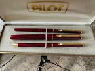 Elevate your writing experience with this mint condition vintage Pilot 3 piece fountain pen, ballpoint, and mechanical pencil set. This vintage set is made in Japan and features a deep glossy Chinese red exterior finish with a gold finish superloy pilot F nib. A great collectible and perfect for those who love wonderful writing instruments. Comes with original light tan faux suede box. Buyer pays $10.00 domestic shipping.
