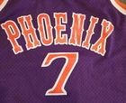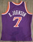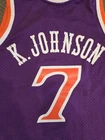 The product is a Men's Mitchell & Ness NBA Swingman Jersey featuring the Phoenix Suns Jevon Johnson from the 1989-90 season. This tank top style jersey is made from jersey fabric in a purple color, making it suitable for activewear occasions. The size is M, and it is designed for men who are fans of the Phoenix Suns and collectors of retro NBA jerseys.