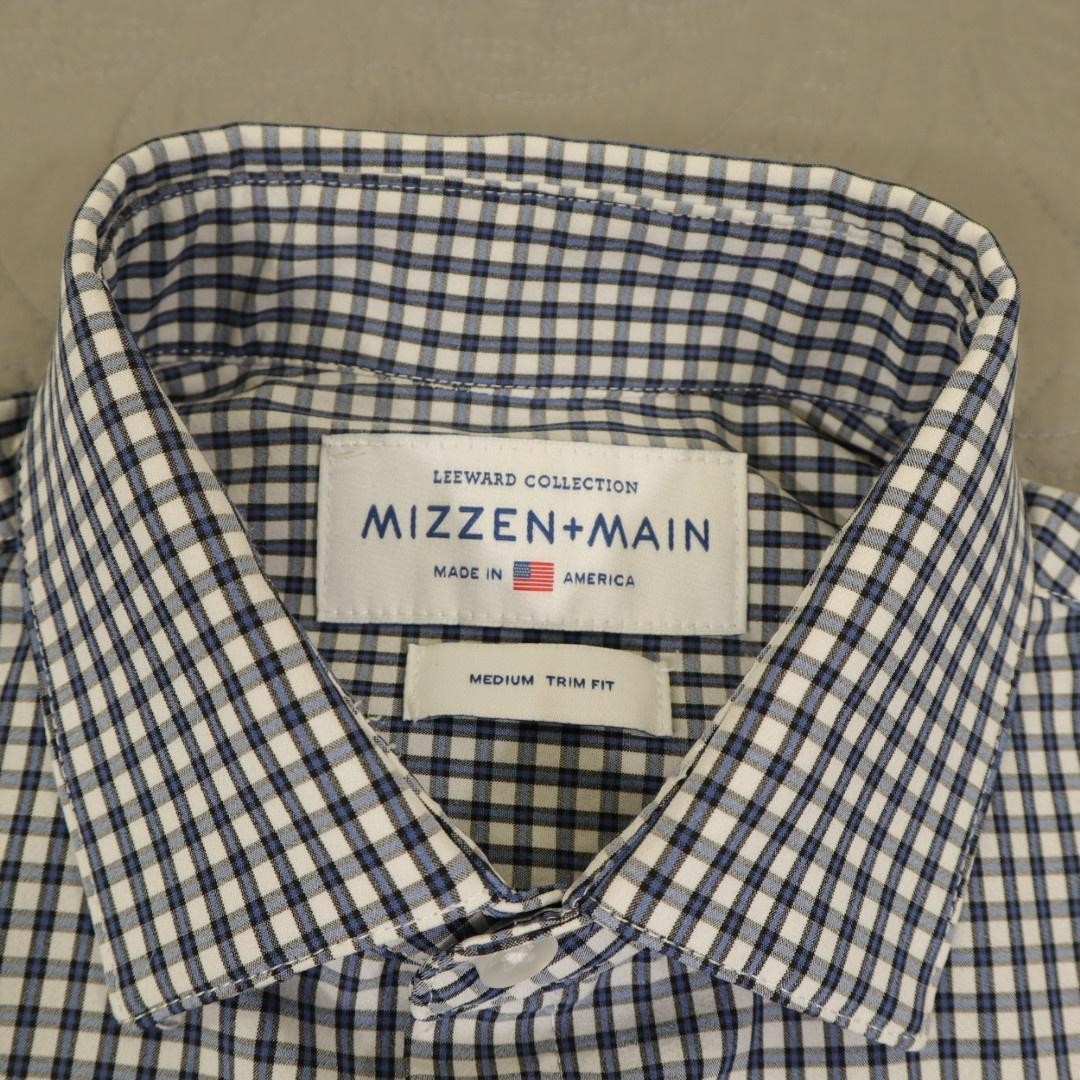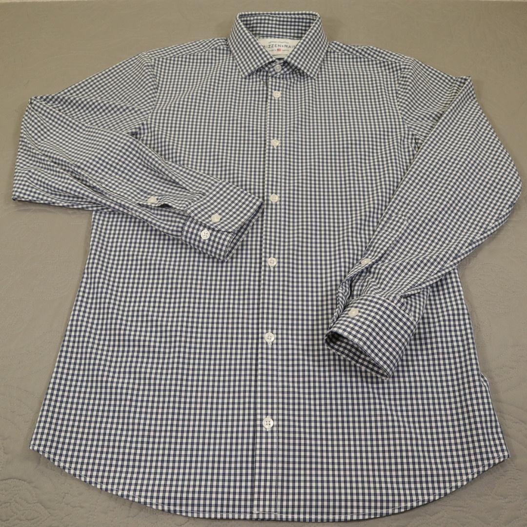 Brand: Mizzen+Main Style: Mens long sleeve dress shirt from the Leeward Collection with spread collar, button front, barrel cuffs, and a curved shirttail hem in a trim, slim-style fit. Color/Pattern: Blue and white gingham check pattern with white buttons for a crisp, modern look. Material: 85% polyester, 15% spandex