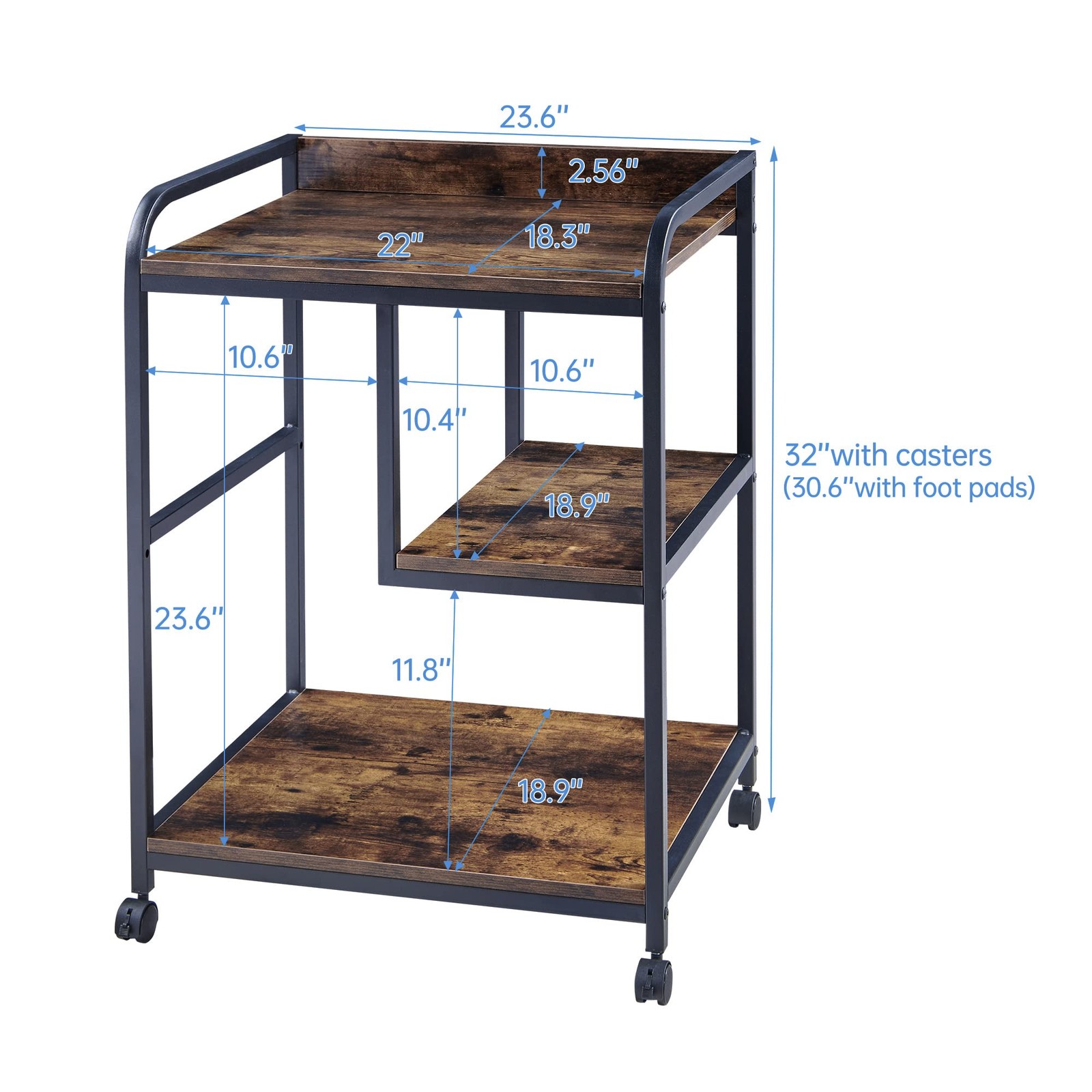 22 x 18 Inch Large Printer Stand, Mobile Printer Table with Wheels for Home Office Storage and Organization, PC Tower Stand, Host Computer Cart, Shelf for Desktop CPU Shredder - Rustic Brown 【Large Size with Tons of Storage Space】Enlarged tabletop 22"W x 18"D offers ample space for holding large and heavy printer, scanner and other bulky machinery. Spacious computer tower slot with internal size 23.6"H x 10.6"W x 18.9"D can accomodate most PC cases and is also ideal for paper shredders. The unique middle floating shelf is a pleasing addition to keep your books, printing paper, toner and other office supplies organized, and it can be reversed with the computer tower slot according to your needs. 【Sturdy and Heavy Duty】Each shelf of this printer stand is supported by the robust steel tube underneath rather than simply screwed into the side frame, contributing to a solid construction and exceptional load capacity. High quality particle board with water- and wear-resistant surface and strong powder-coated steel tube frame makes it quite a durable stand table that you can count on for years. 【Smooth Modern Appearance】The rustic brown tone combined with stylish streamlined lines and elegant smooth curve delivers a touch of simple modern aesthetic, making it an appealing office furniture, which stands apart from many other alternatives in the market. 【Multi-Functional】It's definitely more than just a printer stand, a computer host stand, a paper shredder stand for your office organization. It's also an end table next to your sofa in the living room, a night table accompanying your bedtime in the bedroom, a fish tank stand or even a mini fridge stand with extra storage by your side. 【Both the Feet and Casters Included】The package comes with both adjustable feet and rolling casters so that you can either keep the stand stationary with the feet and enjoy the full stability or mount the casters to move the stand around flexibly and enjoy the mobility. 2 of the 4 wheels are lockable to keep the cart in position. 【Easy Assembly】Assembly becomes interesting and fulfilling when you open the package seeing the straightforward instructions, the flawless parts packaged neatly and numbered clearly, well aligned holes coming with nice anchors to accept the screws, a spare piece for each type of screw included in case one goes missing, and a full set of installation tool provided for easy assembly.