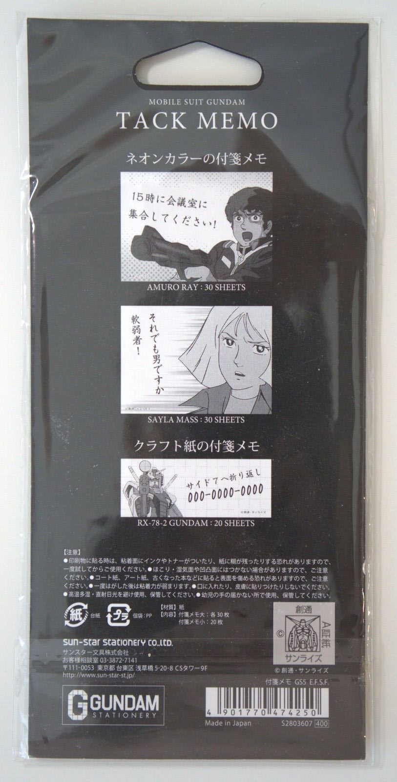 Amuro Ray : 30 sheets (51mm x 73mm) Sayla Mass : 30 sheets (51mm x 73mm) RX-78 Gundam : 20 sheets (30mm x 73mm)