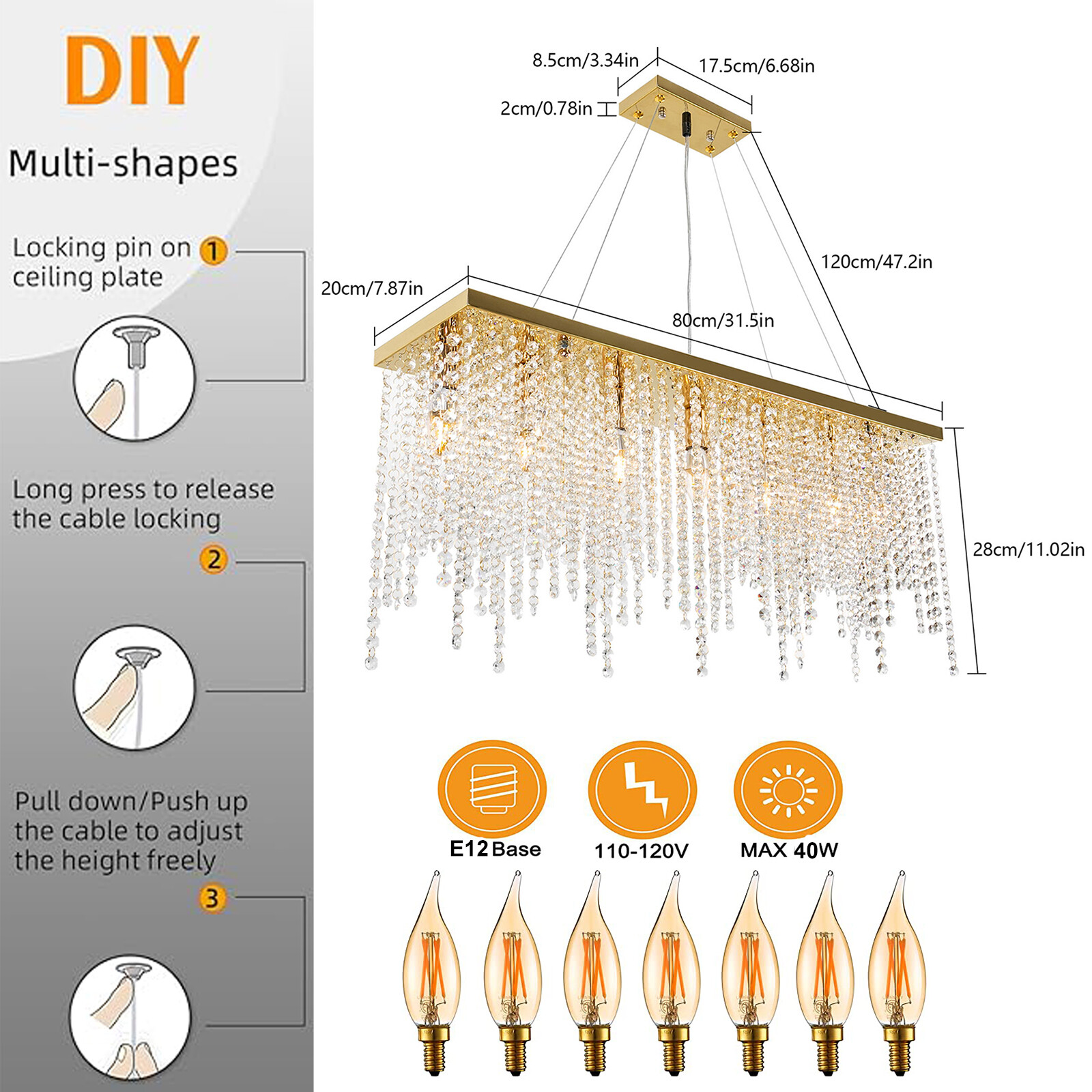 Indoor Pendant Light 110v Dinning Living Room Modern Crystal Glass Chandelier Description This gold pendant light with an elaborate waterfall design will give your space an air of nobility and elegance. It is crafted from stainless steel and glass with fine workmanship for durability. You can install 7 E12 bulbs to make it give out a soft and charming glow, adding infinite luster to your room. Application It is suitable for the dining room, kitchen island, living room, bedroom, bar, restaurant, hotel, coffee shop, office, craft room, hotel, conference, salon, and so on. Specifications Color: Gold Style: Modern Shape: Rectangular Material: Stainless Steel, Glass Process: Cutting, Polishing Assembly Required: Yes Mount Type: Ceiling Mounted Indoor/Outdoor Use: Indoor Light Fixture Form: Chandelier Power Source: Corded Electric Efficiency: E Voltage: 110V Max. Adjustable Height: 1m/3.28ft Suitable Height: 3-5m/9.84-16.4ft Max. Single Bulb Power: 40W Light Source: 7* E12 Bulbs (Not Included) Illumination Area: About 15-20㎡/161.46-215.28ft² With 5W LED Bulbs(Not Included) Base Size: 17.5*8.5*2cm/6.89*3.34*0.78inch Product Size(Wire Excluded): 80*20*28cm/31.5*7.87*11.02inch Wire Length: 120cm/47.2inch Package Included 1*Pendant Light 1*English Instruction Other Needed Accessories Build to Last: This product uses stainless steel and glass as materials with a polishing process, which can resist rust, corrosion, and deformation, and has a long service life. Stylish Appearance: The gold rectangular frame with crystal-like pendants hanging around looks like a beautiful waterfall and presents a luxurious and exquisite look that will fit in with most modern decor. Thoughtful Design: The semi-open structure can effectively dissipate the heat generated during use while allowing for easy installation and replacement of the bulb(not included). Good Lighting Effect: You can install 7 E12 bulbs(not included) to provide a lighting area of about 161.46-215.28ft² with LED 5W bulbs(not included) and its glass pendants allow light to exude smoothly and softly to illuminate your life. Dimming Compatible: You can purchase the appropriate dimmers and dimming bulbs(all are not included) to adjust the light color and brightness to create different atmospheres according to your needs. Adjustable Height: With an adjustable height of 3.28ft(maximum), you can adjust it according to your preferences and the height of the room. Sturdy Base: The rectangular base increases stress area and makes the light fixed firmly without falling easily. Notes Please check the size carefully before ordering. Please note that the bulb is not included in the package and this product does not apply to ceilings whose tilted angle is over 30°. Please make sure the power is cut off before installation. To ensure your safety, we recommend that two people install it together. Please install it by someone with an electrical license if necessary. Please wear electric insulation gloves (not included) and avoid scratching the surface of the item and the electric wire when installing. Please cut off the power supply when you clean the light. Please wipe with a soft cotton cloth and do not use household cleaning agents with corrosive composition . Please allow the slight color difference caused by the shooting light and 1-3cm error due to manual measurement, and make sure you do not mind before ordering. Payment Delivery details Terms of sales About us Contact us Payment We accept ebay payment 。 Fees such as import duties, taxes are not included in the item price or shipping costs. These charges are the buyer's responsibility. Delivery details Shipping: 2-9 working days to: USA Terms of sales We maintain high standards of excellence and strive for hundred percent customer satisfaction. Feedback is very important to us. We hope that you contact us immediately before you give neutral or negative feedback, so that we can address your concerns. It is impossible to address issues if we do not know about them! About us Your satis faction is our ultimate goal. We work hard to earn your trust and future business. Our certified technicians have tested each item before shipping. The unit comes with 1 year limited warranty on all manufacturing defects. a) If you receive a defective item, you may return it or ask for a discount. Please contact us within 14 days after you receive the package. b) What you returned must be intact and in its original packaging as re? u. Customer is responsible for shipping costs of the returned item. c) We will cover the cost of shipping back t with the shipping rate indicated in the registration page. We will send you a new unit or refund the full payment you paid. Thank you. Contact us Business Hour Business Hour: Monday To Friday: 8:30 AM to 5:00 PM (Beijing China time) Due to time zones, our reply to your questions may not be immediately. But within above working time, we will reply your email within 24 hours. If it's non-workdays, please kindly be patient and wait till Monday. Please contact us with ebay message. Please feel free to contact us if you have any questions. Monday To Friday: 8:30 AM to 5:00 PM (Beijing China time) Due to time zones, our reply to your questions may not be immediately. But within above working time, we will reply your email within 24 hours. If it's non-workdays, please kindly be patient and wait till Monday. Please contact us with ebay message. Please feel free to contact us if you have any questions. Brand Unbranded Type Chandelier Material Glass, Stainless Steel Style Modern Room Living Room, Dining Room Color Gold Light Color Warm White Installation Area Indoor Department Adults Power Source Corded Electric