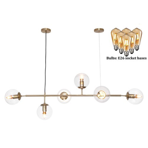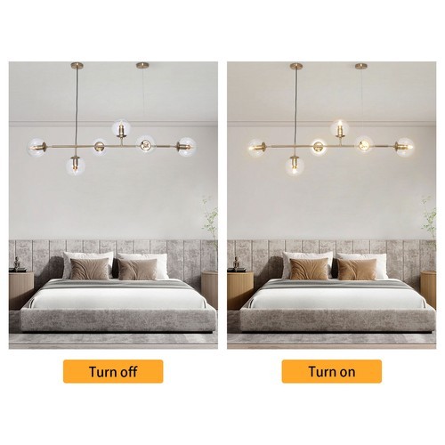 Modern 6-Lights Globe Ceiling Light Pendant Lamp Linear Chandelier Living Room Description A quality pendant light starts with great functionality and quality materials. Our 6-light modern globe pendant light has a beautiful shape and when you turn it on, it will produce a beautiful and different lighting effect on your home's ceiling, adding elegance to your home. So this would be an ideal purchase. Key Features Build to Last: Our pendant light is made of high-quality glass and iron and adopts an electroplating treatment, so it is resistant to deformation, oxidation, corrosion, and high temperature, and has a long service life. Strong and Soft Light: Six bulb sockets and clear lampshades allow you to install six E26 bulbs at once (not included). It has an open center that allows light to flow smoothly, providing bright and soft light to illuminate your life, and providing 161.46 to 215.3ft ² irradiation area to fully meet your needs. Unique Style: The light has a modern vibe with clear glass shades diffusing light to create a warm glow, adding a northern Europe vibe and ample lighting. Meanwhile, the gold color also brings the drama of medieval modern chandeliers to kitchens or other spaces. Adjustable Height: The ceiling-mounted cord allows this light to have different drop lengths (3.94ft adjustable) to create different lighting effects and decorative looks, and the sleeve on the cord can be securely fastened. Easy to Install: You just need to connect the wire reserved on the ceiling, screw the E26 bulb into the lamp holder, and then control this pendant light with the switch reserved on the wall. Easy to Clean: Thanks to the simple structure and smooth surface, you can easily wipe it clean with a rag. Ideal Gift: Because of its beautiful appearance and classic design, you can give it as a gift to your friends or colleagues on Christmas, Thanksgiving, and other holidays. Customer Service: We aim to provide quality products and services. If you have problems, please feel free to contact us. We will reply and solve the problem for you as soon as possible. Details Round Base: The large base(4.72inch) increases stress area, and can make the pendant light fixed firm without falling easily. 6 Standard Sockets: The intricate design makes it possible for you to install the standard E126 lamp head is easy to purchase and replace and is suitable for incandescent, CFL, halogen, LED bulbs, etc . in 6 different locations to make the whole room look more beautiful and bright. Application With a lighting area of 161.46-215.3ft², it is ideal for high, low or parallel ceilings, kitchens, hallways, living rooms, bedrooms, balconies, bars, aisles, foyers, hotels, restaurants, corridors, cafes, dining rooms, children's rooms, libraries, billiard parlors, and other indoors. Specifications Material: Glass, Iron Style: Mid-century Color: Gold and Clear Process: Electroplating Assembly Required: Yes Mounting Type: Ceiling Mount Indoor/Outdoor Usage: Indoor Use Only Light Fixture Form: Pendant Light Direction: Downlight Efficiency: E Model: JX09 Voltage: 110V Light Source: 6* E26 Bulbs (Not Included) Max. Bulb Power(Each): 60W Applicable Area: 15-20m²/ 161.46-215.3ft² Adjustable Height: About 1.2m/3.94inch Lampshade Diameter: 15cm/5.9inch Base Diameter: 12cm/4.72inch Product Size: 122*44*143cm/48*17.32*56.29inch Package Included 1* 6-Light Modern Globe Pendant Light 1* English Manual Other Accessories for Assembly Notes Please check the dimensions of the product before ordering to ensure it fits your home. Please note that the 6 bulbs and switch are not included. Please do not install the lamp next to the air conditioner or heater, so as to avoid rusting and paint falling due to moisture, which will affect the service life of the lamp. Please wear electric insulation gloves and avoid scratching the surface of the lamp plate and the electric wire when installing. Please make sure that the power supply has been cut off before installation, and conduct a power test before installation. For safe and reliable installation, make sure that the electrical box in which the fixture is to be installed is properly connected to the structural elements of the building. All wires are connected. When unpacking, be careful not to pull with the wires, as this may result in a poor connection. Do not connect power until your fixture is fully assembled. Please do not touch the bulb or look directly at the lighted bulb while the fixture is open. Keep flammable materials away from the bulb. Please use the lamp within the applicable voltage range and clean lamps regularly. Please cut off the power supply when you clean the light or replace light bulbs. Please allow the slight color difference caused by the shooting light and 1-3cm error due to manual measurement, and make sure you do not mind before ordering. Payment Delivery details Terms of sales About us Contact us Payment We accept ebay payment 。 Fees such as import duties, taxes are not included in the item price or shipping costs. These charges are the buyer's responsibility. Delivery details Shipping: 2-9 working days to: USA Terms of sales We maintain high standards of excellence and strive for hundred percent customer satisfaction. Feedback is very important to us. We hope that you contact us immediately before you give neutral or negative feedback, so that we can address your concerns. It is impossible to address issues if we do not know about them! About us Your satis faction is our ultimate goal. We work hard to earn your trust and future business. Our certified technicians have tested each item before shipping. The unit comes with 1 year limited warranty on all manufacturing defects. a) If you receive a defective item, you may return it or ask for a discount. Please contact us within 14 days after you receive the package. b) What you returned must be intact and in its original packaging as re? u. Customer is responsible for shipping costs of the returned item. c) 
