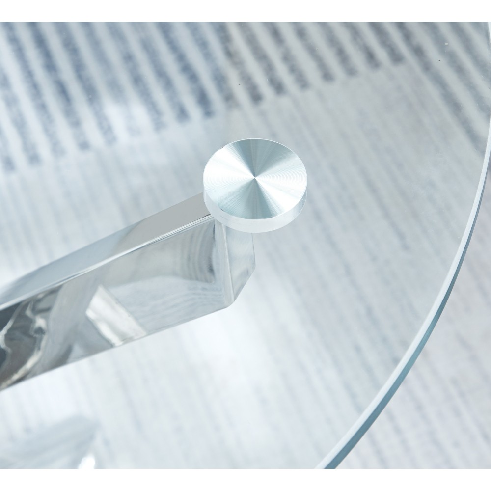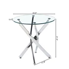 Modern Round Tempered Glass End Table - 23.6" Diameter, Chrome Silver Legs Elevate your living space with this ultracontemporary round end table, where sleek design meets exceptional durability! Crafted with 0.39-inch thick clear tempered glass and chrome-plated metal legs in a gleaming silver finish, this table blends sculptural style with practical functionality. Measuring 23.60” in diameter and 21.90” in height, it’s perfectly sized for modern young homes, adding a polished touch to living rooms, bedrooms, or home offices. Ultracontemporary Styling for Modern Spaces : Designed to anchor your decor in contemporary flair, this end table features a sculptural metal base composed of four angular, slanted posts. The gleaming chrome silver finish adds a touch of sophistication, while the round tempered glass tabletop creates an open, airy look that complements a variety of interior styles—from minimalist and industrial to modern chic. It’s a statement piece that enhances your space without overwhelming it. Durable Tempered Glass Tabletop : The tabletop is crafted from 0.39-inch thick tempered glass, renowned for its exceptional strength and resistance to damage. Unlike regular glass, tempered glass is shatter-resistant and durable, making it safe for everyday use—ideal for placing drinks, books, decor items, or electronics. The clear glass design also lets light pass through, brightening your space and creating a seamless blend with existing furniture. Sturdy Chrome Legs with Balanced Design : The base features chrome-plated stainless steel legs that combine stylish aesthetics with long-lasting durability. The angular, slanted posts add a sculptural edge, while small leveler feet ensure the table stays balanced and even on any surface—preventing wobbling and protecting your flooring. Round supports securely affix the base to the glass tabletop, enhancing overall stability for reliable use. Perfect Size for Versatile Use : With a 23.6-inch diameter tabletop and 21.9-inch height, this end table is thoughtfully sized for contemporary living spaces. It’s compact enough to fit beside sofas, armchairs, or beds, yet spacious enough to hold daily essentials. Whether used as a side table for drinks, a display spot for decor, or a convenient surface for remote controls, it adds both style and functionality to your home. Easy Installation & Long-Lasting Use : The chrome legs feature a user-friendly design that simplifies installation—all necessary hardware and instructions are included for a hassle-free setup. The durable construction, from the tempered glass to the chrome-plated metal base, ensures the table withstands daily wear and tear for years of reliable use. It weighs 21.80 lbs, making it easy to move while maintaining stability. Versatile Color Adaptability : Available in multiple color options (including this sleek chrome silver), this end table easily adapts to different home decoration styles. Whether you’re looking to complement neutral tones, add a metallic accent, or match existing chrome fixtures, it offers flexibility to fit your unique decor vision. Care & Maintenance Tips : Clean the tempered glass tabletop with a glass cleaner and soft cloth to remove fingerprints and dust. Wipe the chrome legs with a dry cloth to maintain their gleaming finish and prevent tarnishing. Periodically check the leveler feet and base connections to ensure stability, and avoid placing heavy objects beyond the table’s capacity. Worry-Free Purchase Guarantee : We stand behind the quality of this modern round tempered glass end table with a 1-Year Warranty. If you’re not completely satisfied with your purchase for any reason, we offer a 30-Day Free Return & Exchange Policy. Shop with confidence, knowing you’re investing in a stylish, durable, and functional addition to your home!