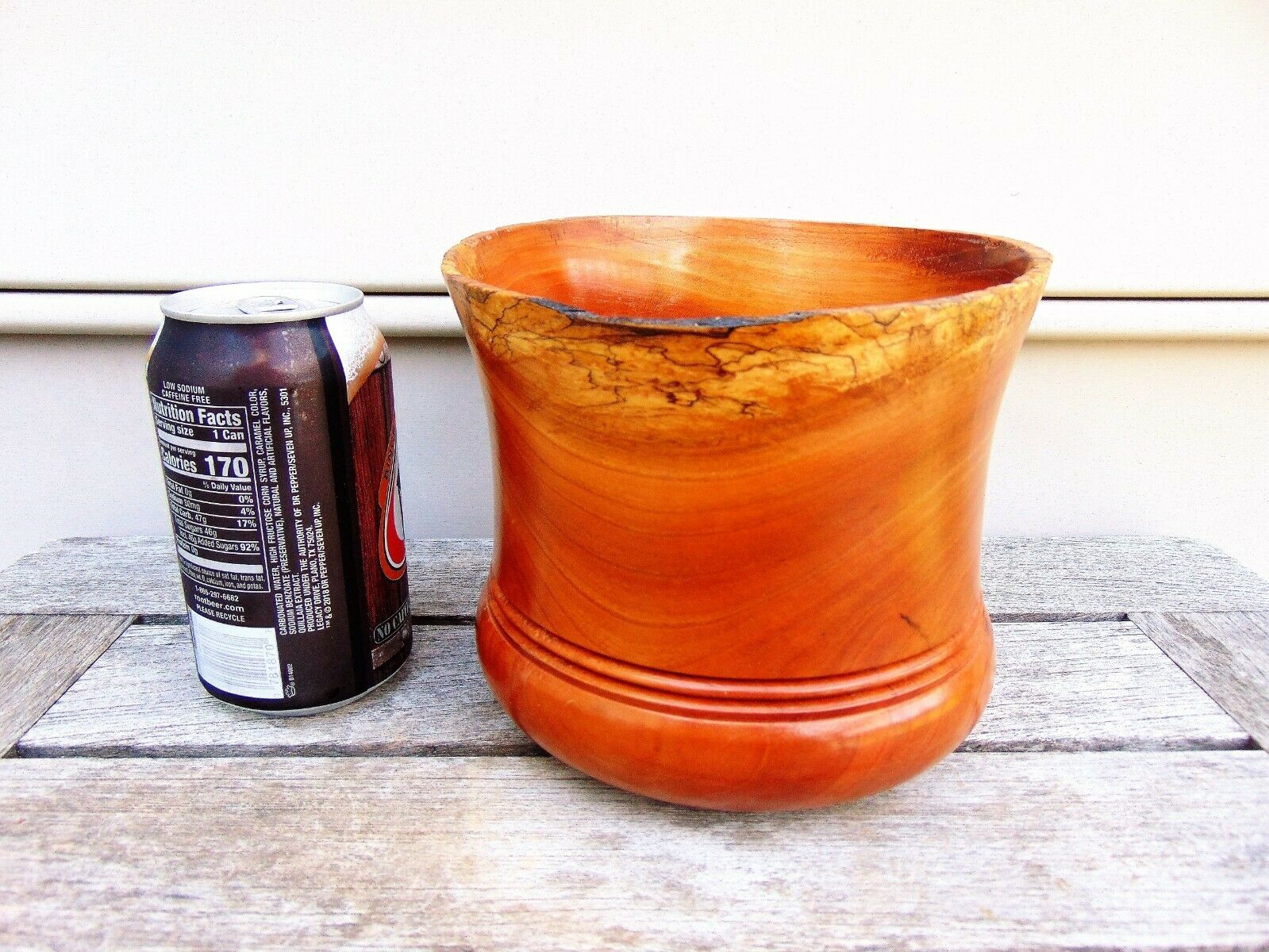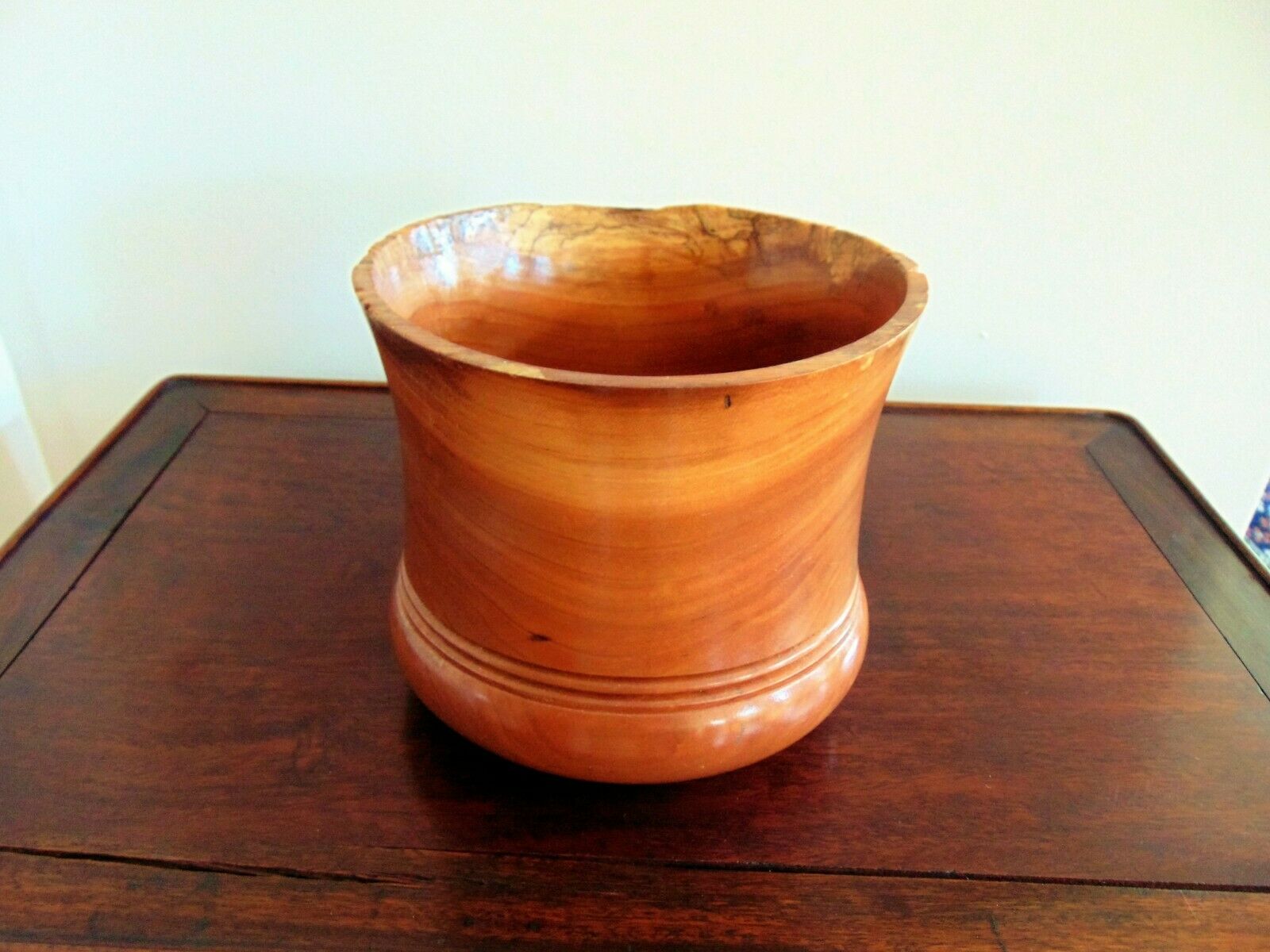 A handmade wooden bowl from highly figured solid cherry heartwood on a raised base. It has an attractive finish that is smooth to the touch. The bowl's rim was intentionally roughly finished. Modernism. Minimalist. Its stiff hardwood is a distinctive color in light to dark reddish brown cherry heartwood. It grows generally through the eastern part of the United States The given wood type is identified on its bottom as cherry (Cherry, Black) along with a signature and date 01-03.