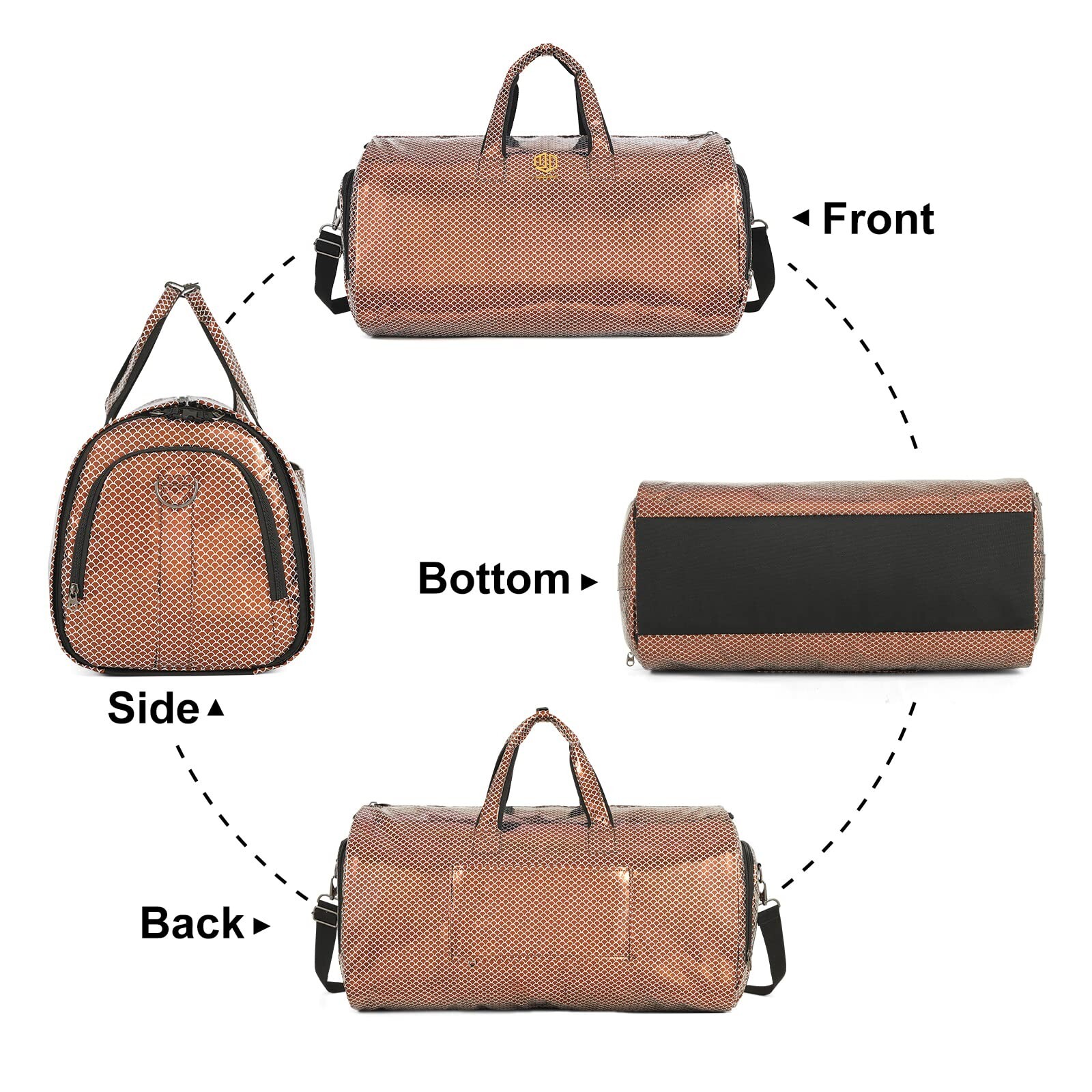 Modoker Carry on Garment Bags for Travel, Convertible Garment Duffel Bag with Shoulder Strap for Men Women- 2 in 1 Hanging Suitcase Suit Travel Bags, Glitter Red Product Details Color: Bling Red Brand: Modoker UPC: 724901097722 EAN: 0724901097722 MPN: Does not apply Product Dimensions: 37.5 x 11 x 11.8 inches Item Weight: 2.5 pounds Department: Unisex Adult Manufacturer: MODOKER Country of Origin: China TWO IN ONE MODOKER BAG: With the stylish and shiny design of combining the fashion of Garment Bag and Duffel Bag, Modoker PU Leather Garment Duffel Bag is not only a Overnight Travel Weekender Bag, but also a great Duffel Hanging Clothes Bag.If you are heading for a business trips or weekend getaway, this bag will be a great choice 45L-LARGE CAPACITY with SHOES COMPARTMENT: After assembled, this garment duffel bag work perfect as a 45L duffel bag/travel weekender bag. At the right side pocket of this leather garment bag is a shoes pouch. And the left side pocket is designed for passport, keys and some other small items. Convenient pockets for Quick access. Leather Garment Bag with back strap for luggage NO WRINKLE-HANGING- DESIGN GARMENT BAG: No Wrinkles Trouble Your Dress or Suits Any More. You will have a wrinkle-free suit or dress at any given time by using this Modoker Hanging Leather Garment Bag. Moreover, while open this Modoker Garment Bag and lay it out, it can be a great hanging garment bags for traveling STURDY-MATERIAL DUFFEL BAG: This garment bag is made with high-quality waterproof PU leather and premium polyester Fiber, sturdy zipper, jacquard with Vegan Leather accents which is scratch-free and anti water splashing. With a detachable and adjustable shoulder strap, it can be change as a shoulder bag if needed. You can easily adjust the detachable shoulder strap to fit your shoulder perfectly. CARRY-ON GARMENT DUFFEL BAG: Garment Bag Dimension: 37.5L x 20.8W, 45L Duffel Bag Dimension: 22.8L x 11W x 11.8H; Weight: about 3.2 pounds. This soft- sided garment bag meet the require of sizer at the airport (Length + Width + Height: up to 51 inches / 130cm). So this Modoker Leather Garment Duffel Bag can be taken as your carry on luggage items