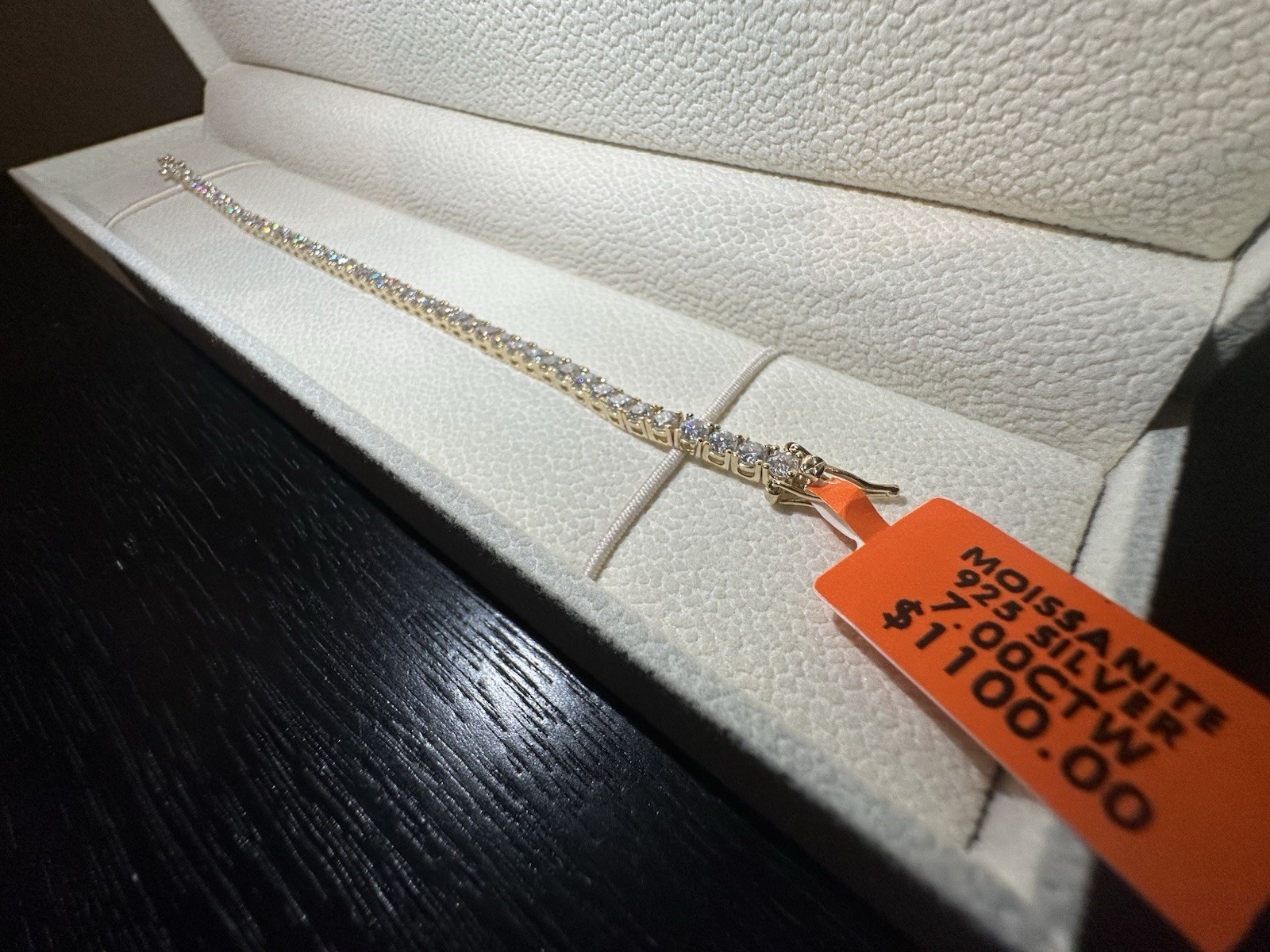 Bracelet is 7 inches long 3mm thick stones are moissanites, yes they pass the diamond tester test. It is stamped 925 for authenticity It is sterling silver with 18K gold vermeil If you don’t know what that is it’s a high-quality, durable form of plated jewelry consisting of a thick layer of 18-karat gold (at least 2.5 microns) over a sterling silver base, offering a luxurious look and hypoallergenic properties. It is more durable and valuable than standard gold plating, costing less than solid gold but more than cheaper plated alternatives. IT WILL LAST LONG IF MAINTAINED WELL. If this isn’t within your budget I also have other 10k 14k solid gold pieces as well as 925 Sterling silver rings earrings necklaces etc on my page for sale or auction good luck bidding as well as purchasing !