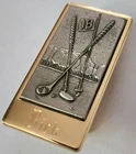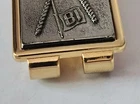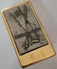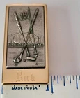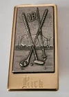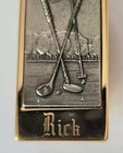 This vintage Anson money clip has a unique pewter-look golf design. It is in gold and silver (pewter) tones. It is personalized and perfect for the golf enthusiast named Rick. The clip is 2 inches in length and 15/16 inch in width, with a color of gold and unknown material. It is a pre-owned item. The money clip is from the Men's Accessories section. It is a great addition for someone you love named "Rick" s golf-themed collection. The country or region of manufacture is unknown. This Anson money clip is a must-have for any stylish and fashionable man who loves golf. It's very durable and is Anson quality. It is pre-owned and has not been cleaned. It has areas that show age. These do not affect the use of the clip. Some may be cleaned or buffed out. But look at the pictures carefully and consider them part of the condition description. Please ask any questions before buying Thank you for looking.