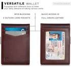 12 Month Warranty - The Warranty covers any factory defects as a result from the manufacturing process of the product. Walk confidently with . Security. Safety. Privacy. - Our wallets are equipped with advanced RFID SECURE Technology, a unique metal composite, engineered specifically to block 13.56 MHz or higher RFID signals. Our quality RFID material protects the valuable information stored on RFID chips from unauthorized scans. Feel safe because your information is protected! Slim your Pocket – How it Works - This slim wallets for men reduces bulk with an efficient minimalistic design that makes everything easier. Best fits 7-10 credit cards, an ID plus US bills. Total of 11 available card slots (including 2 secret pockets). Perfect for carrying all debit, credit and all other cards. Store cash using the innovative stainless- steel money clip. Wallet Size: 4.3” in x 3.1” in x 0.6” in Stylish & Practical – Functionality at it’s Best - Finally! A wallet that will meet your everyday needs and fits in your pocket without bulging. 2 convenient outside card slots made for your most used cards; Instantly have the cards you need to save time and energy. Photo ID slot located on the outside of the wallet; a smart solution to instantly access your ID. Innovative stainless-steel money clip securely holds up to 15 bills; quick payments and organization made easy! Finest Leathers - We use only the finest leathers to make smart and stylish wallets! Premium Full grain leathers that are soft and appealing! Our vintage leathers stay true to their nature by being receptive to scratches. With use the wallet will absorb the natural oils of your hands which will allow the wallet to develop a rich and dark color. Over time, your wallet will develop a character that matches your adventures.