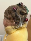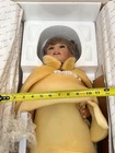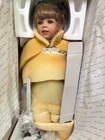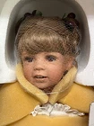 Monika Levenig presents the "Cherry Kisses" collector doll from 2002. This 24" porcelain doll with curly light brown hair and brown eyes is part of the Danbury Mint franchise. The doll, designed by Monika Levenig, comes with an outfit and stand. It features a medium complexion and weighs 10 lb. The doll is an original, collector's item and is in its original packaging.