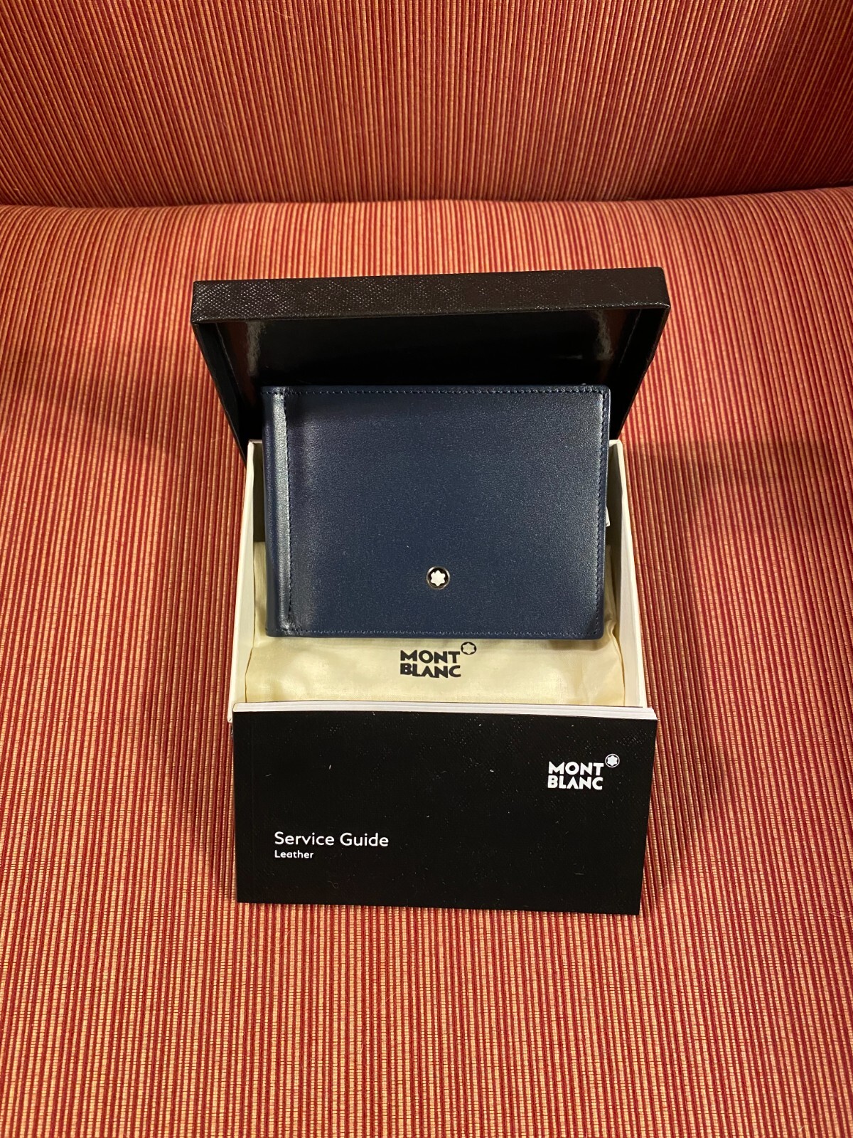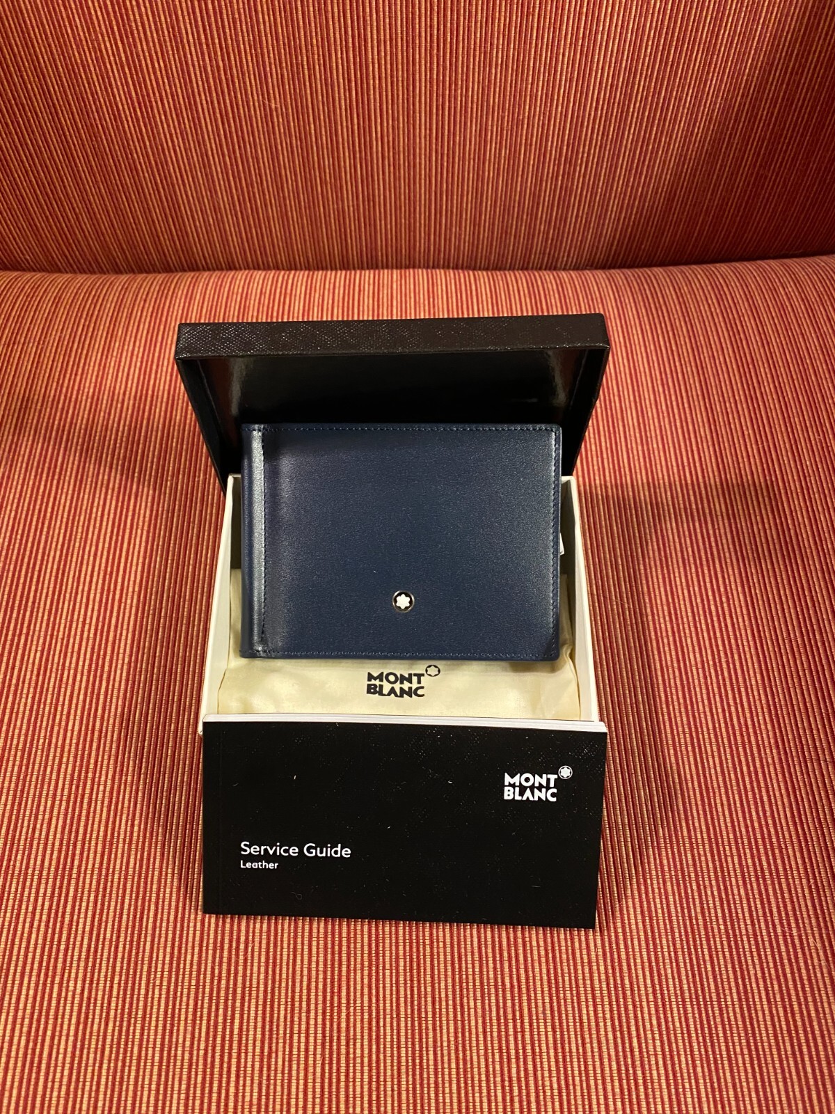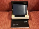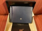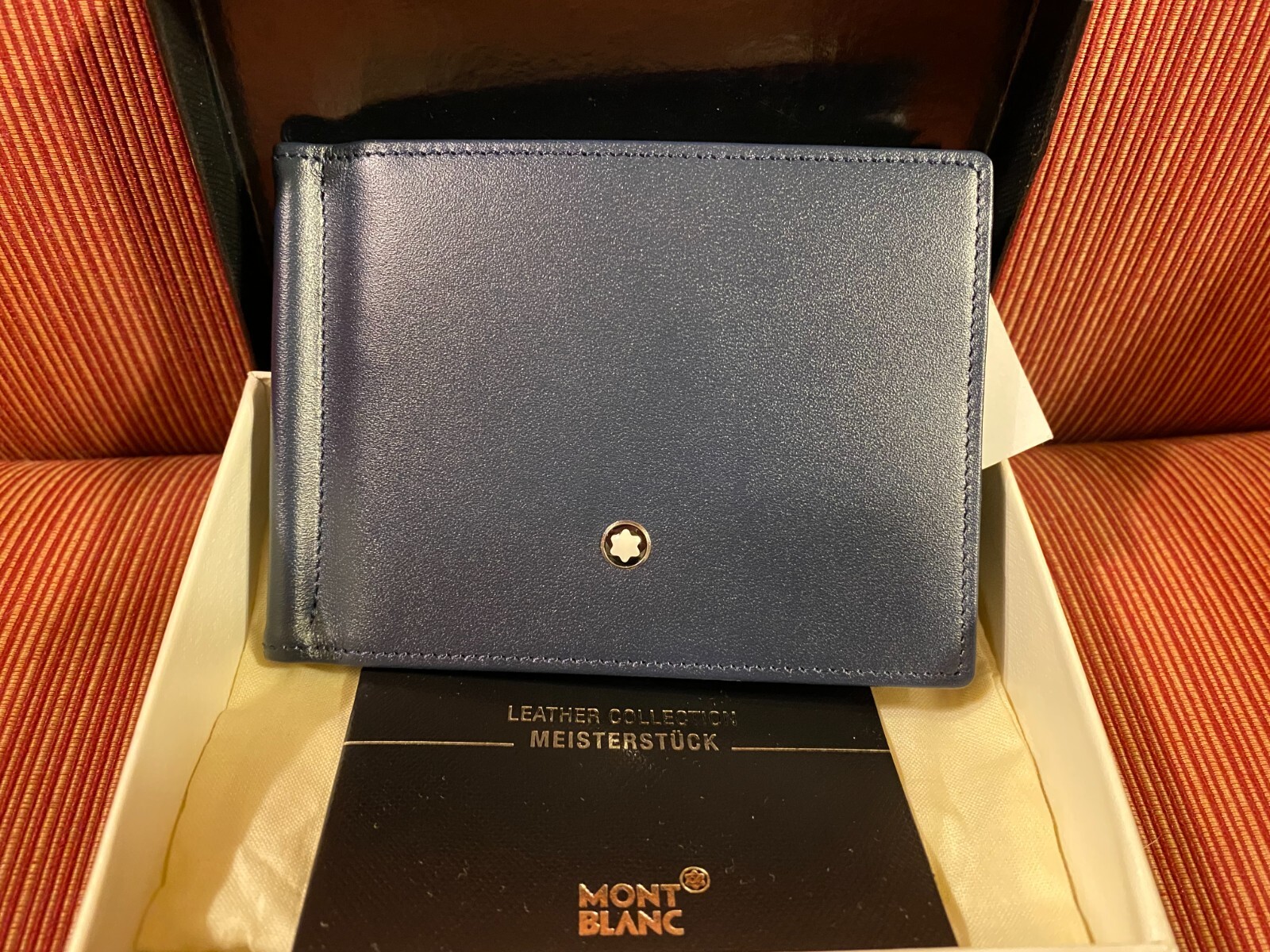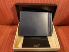 Brand New w/tags in the Box w/dust bag Collection Meisterstuck Material Leather Leather Italian full-grain cowhide with unique Montblanc deep shine, chrome tanned, dyed through Leather Colour Navy Dimensions (cm) 11.5 x 8.5 Interior Organization 6 pockets for credit cards, 2 compartments for cash, 2 additional pockets Function Horizontal Wallet Emblem Montblanc emblem with palladium-coated ring Navy Blue Meisterstück Wallet 6cc with money clip, made of navy blue full-grain cowhide with Montblanc deep shine, jacquard lining with Montblanc brand name, Montblanc emblem with palladium finish ring, with 6 pockets for credit cards, money clip. MB2013