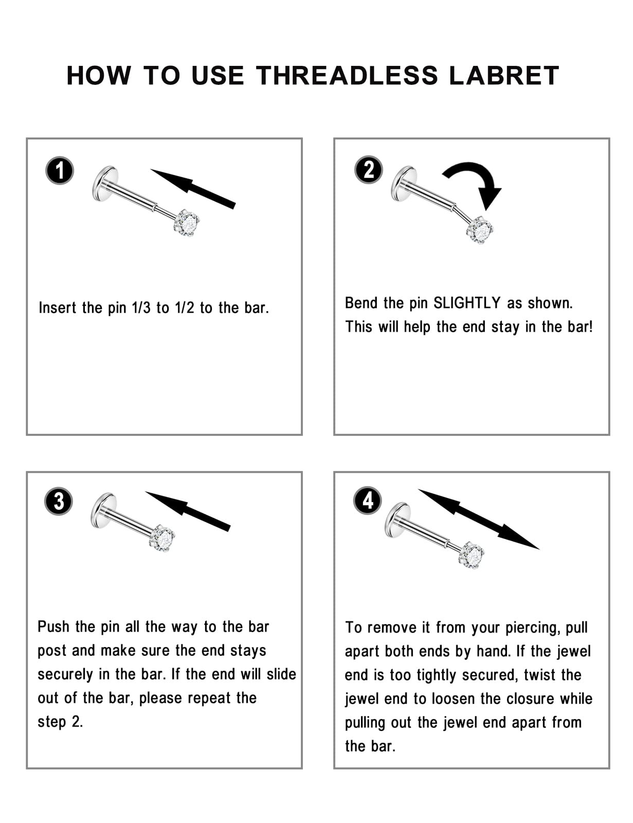 Some push pins are bent in advance, if you found the push pin are straight, Pls BEND THE PIN SLIGHTLY following the second photo to learn how to use threadless labret. This labret stud is soldpush pins are bent in advance, if you found the push pin are straight, Pls BEND THE PIN SLIGHTLY following the second photo to learn how to use threadless labret. This labret stud is sold by piece! Including one top and one post. The measurements are approximate! Bar Gauge (thickness): 18 gauge (1.0mm),Bar length : 6mm. Moon Size: 2mm width, 5mm height. Made of 316L surgical steel, PVD coated with real 18k gold. 316L steel is the most basic metal used in body jewelry. It is the basic requirement of metal to be used in initial piercings and for healing. For most people this grade of steel works just fine. The push in design threadless piercing jewelry looks cute as piercing jewelry. popular for various piercings: tragus, cartilage, helix, lip, nose, earlobe, rook or other piercings it can fit. It's also a popular gift to friends on Birthday, Christmas, Wedding, Valentines Day,etc.