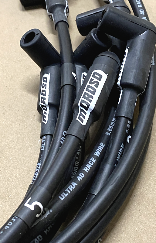 Moroso Ultra 40 Unsleeved Plug Wire Set Part # 73712 (BLACK Wires) BBC & Under Header (8.65mm) Black Wires, 90° Boots, HEI Distributor Style Ultra 40 unsleeved wires are a cost effective version of the Ultra 40 Race Wire without heat sleeving. Wires feature a Kevlar core, four times stronger than other aramid fiber cores, that increases the tensile strength of the wire while reducing its center diameter. This allows for the surrounding insulation to be thicker, resulting in greater dielectric strength. With only 40-ohms of resistance per foot these wires will increase power and fuel efficiency by bring more spark to the plug. RFI/EMI resistant to eliminate stereo feedback or ignition interference.