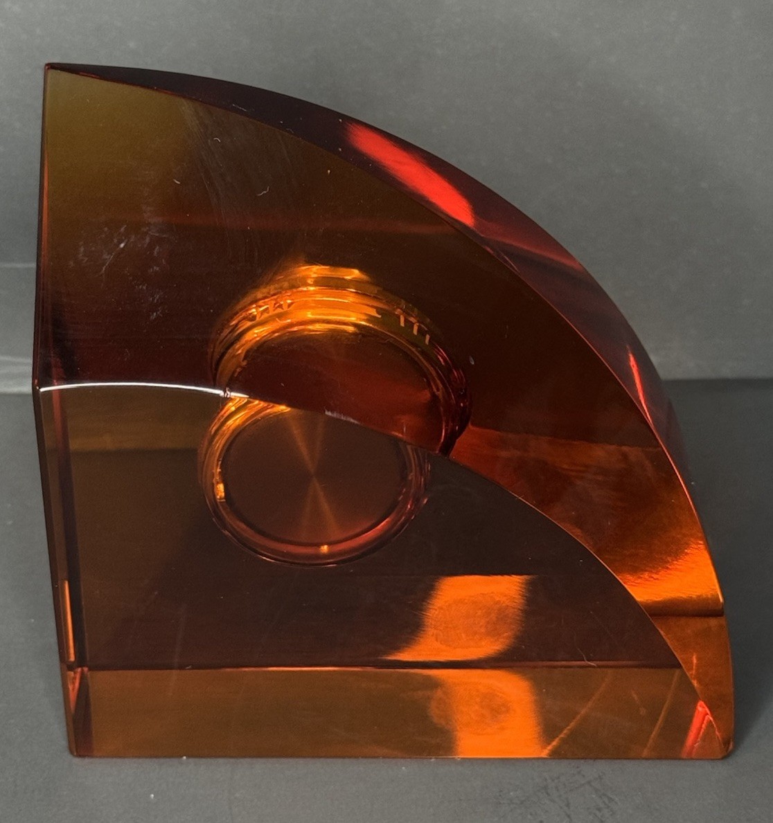 Has a tiny chip and a scratch on the back side shown in pictures