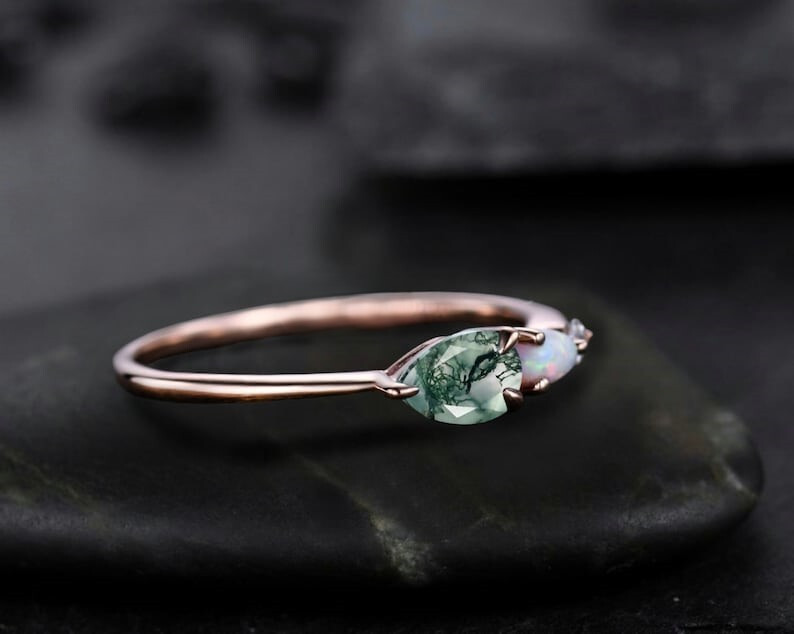 Moss agate & Opal Ring Engagement Ring Pear Cut Gems Art Deco Wedding Ring Product Details. Gemstone - Moss Agate, Opal Stone Shape - Pear Stone Color - Green & White Material - 925 Sterling Silver Ring Sizes : All Size Rings Available Finishing - Silver, Gold, Rose Gold Available PAYMENT POLICY We accept payment through PAYPAL (Credit Card, Debit Card, Net banking, Cheque Payment). SHIPPING & HANDLING Handling time - 1 to 2 working day. Shipping Worldwide. • FREE SHIPPING Standard Shipping (Free) : Normally delivery time is about 10-15 working days. Expedite Shipping ( $20 ) : Normally delivery time is about 3-5 working days. RETURN POLICY • Returns accepted on manufacturing defect. • Please return item in original condition within 30 Days of purchase. • Refund given as Money Back. FEED BACK POLICY Please leave us a positive feedback, if your items arrived in good condition. We will automatically leave you the positive feedback after received your positive feedback. Please contact us before leaving neutral or negative feedback, we always provide the most satisfying service to our customers. Customer satisfaction and repeat customer are our utmost priority. Thank You For Visiting Our Store