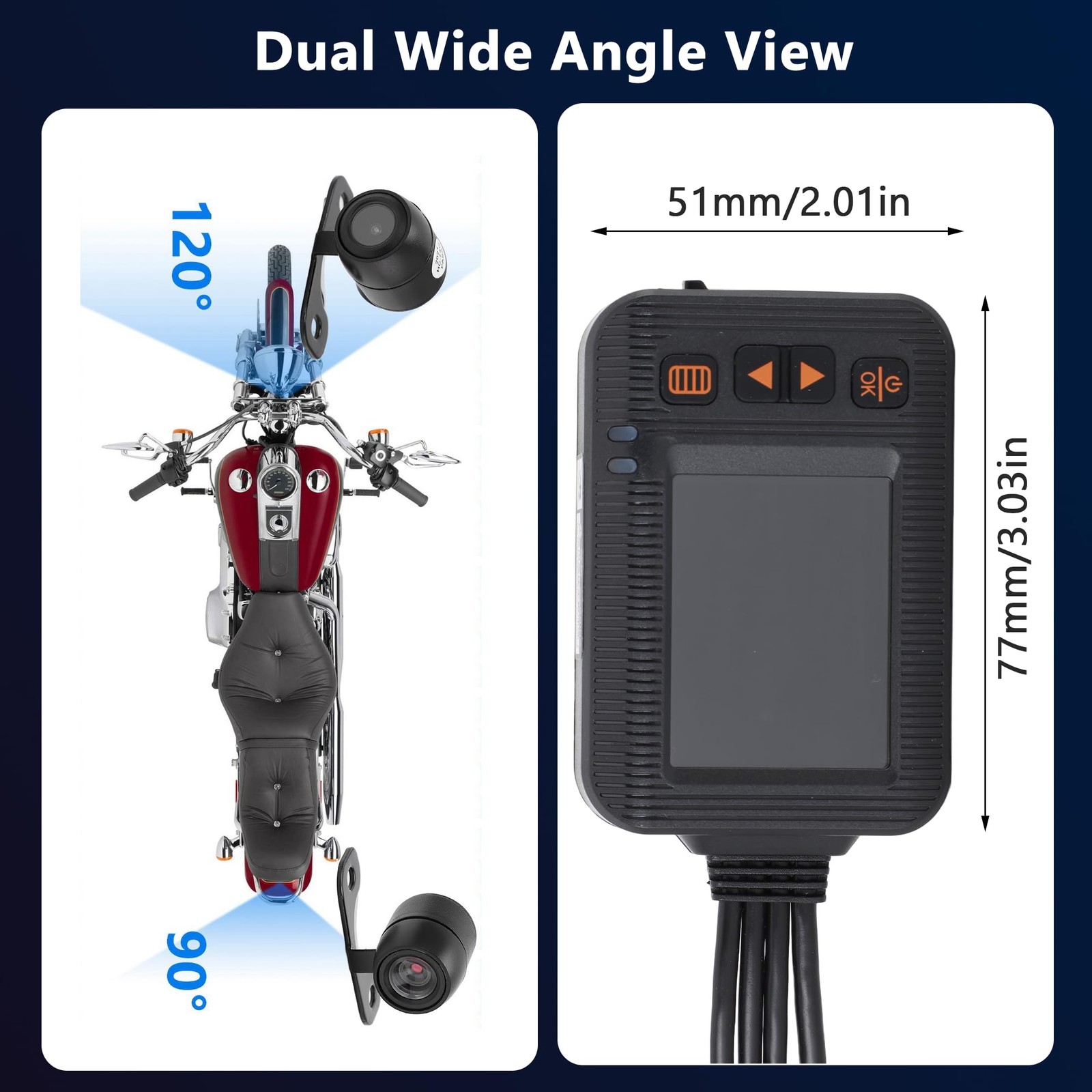 How to Use: Wiring instructions: 1. Red?connect to ACC positive line; 2. Black?connect to the negative circuit of the power supply; 3. ?connect to the power switch button; 4. Yellow?connect to the camera. Specification: Item Type: Motorcycle driving recorder Shell Material: ABS Color: Black Applicable Model: All motorcycles Front Camera Angle: 120° Rear Camera Angle: 90° Display Screen: 2.0in Grade: Host IP65 waterproof, lens and cable IP67 Video Format: VGA Loop Recording: Support, 1 minute, 3 minutes, 5 minutes Frame Rate: 30f/s Recording: Recording by wire controller, support opening and closing Playback: Support video playback, view pictures Support Automatic Shutdown Button Sound Screen Dynamic Induction Parking Monitoring Intermittent Recording: 0ms Memory: Support memory card 4GB-32GB Date Tag: Display on the video screen, support settings Starting Time: 2S Power Supply: 12-24 to 5V Language Setting: Simplified/Traditional/English/Russian/Japanese/Thai/Korean Working Temperature (?): (-20?-70?) Battery Type: High temperature polymer lithium battery 180mAH Wire Control Function: Support camera, lock video, recording function Package List: 1 x Host 1 x Power Cord 1 x Step-Down Line 1 x USB Cable 1 x Button Switch Line 1 x Camera Connection Line 2 x Camera 1 x Bracket 2 x Adhesive Sticker 6 x Screw 1 x Hex Wrench 1 x Manual Ultra Camera: This motorcycle driving recorder (host DVR IP65 waterproof, camera IP67 waterproof) is Whether it's raining or snowing, you can trust that this recorder will continue to function flawlessly. Does not support and . Clarity Recording: The dash cam uses AIT chip and two lenses at the front and rear. Front 1080P, rear 720P, using lossless AHD dual , super anti‑interference, avoid vibration and flicker. Does not support tracking and connection to mobile APP, only supports DVR host playback, or remove the memory card to connect to the computer to play video. Intelligent Parking Protector: After installing the driving recorder wiring kit, it can be turned on and off when the motorcycle is turned on/off. When the parking mode is turned on, it will automatically start recording when the motorcycle collides while parking. Ensuring that every detail on the road is captured accurately. Loop Recording: Motorcycle DVR use built‑in sensor, which automatically locks the recorded video file in an emergency (severe vibration, car accident collision). The motorcycle driving recorder supports up to 32GB memory card (excluded). When the capacity of the memory card runs out, it will automatically overwrite the old files in order. Wired Control: Motorbike Camera comes with a wired controller. The controller features a recording status indicator and a microphone, allowing you to start/stop recording and lock video files with a simple press of a button. Install it on your motorcycle's handle for quick and hassle-free control, enhancing your overall recording experience.