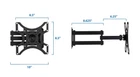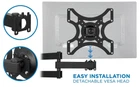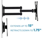 Mount-It! TV Wall Mount Bracket with Full Motion Arm Fits 13-42" Flat Screen TVs VESA 75, 100, 200, 55lb Weight Capacity WITH 15" EXTENSION MI-407-1 TV wall mount fits the majority of displays in the 19-42" size range. Removable VESA bracket allows easy installation, as well as ability to take the TV out of the mount without removing the mount from the wall - ideal for outdoor installations. It fits VESA 75x75, 100x100, 200x100, 200x200. If you are unfamiliar with VESA patterns, these are square or rectangular patterns between 3 and 8 inches per side. Weight limit is 55 lbs. This mount provides 15" of extension and collapses to 2" from the wall. This is a full motion mount with 360 degrees of rotation, +/- 15 degrees of tilt and 180 degrees of swivel. The load bearing portions of the mount are constructed from High Grade Steel providing a sturdy and reliable mount and separate cover pieces for the wall plate and pivot joints providing a clean finished look. The package includes the mount, manual, all necessary installation hardware. SPECIFICATIONS Screen Sizes: 19” up to 42” (inches) Extension: 15" Tilt: (+/-) 15 degrees Swivel: 180 degrees (from base) Rotate: 360 degrees VESA Compatibility: 75x75, 100x100, 200x200 (mm) Weight: 55 lbs Material: Steel Manual: Yes Hardware Included: Yes ARTICULATING TV WALL MOUNT - Articulating arms offer full motion capability. Swivel 180 degrees, Rotation 360 degrees, Tilt 15 degrees up and down VESA COMPATIBLE - Fits 75x75, 100x100, 200x100, 200x200 Up to 55 lbs. Ideal for small to mid-sized TVs UNIVERSAL TV BRACKET - Compatible with all the TVs in the market with VESA patterns of 75 (3" x 3") to 200 (8" x 8") bolt hole patterns. This pattern is typically suitable for 27, 29, 30, 32, 37, 40, 42 and even some 47, 50 and 55 Inch TVs. EXTENSION WITH LONG ARM - Extends up to 15 inches away from the wall. Ideal for corner installations or as a monitor wall mount. EASY INSTALLATION - Removable Plate allows the mount and TV to be installed separately - perfect for outdoors. Hardware and Instruction Manual Included.