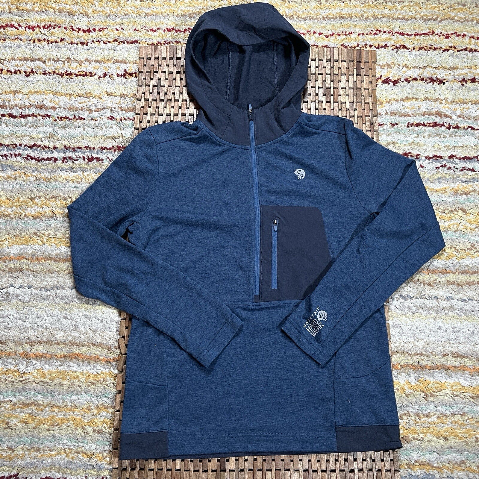 Crafted for the outdoor enthusiast, the Mountain Hardwear Cragger Hoody combines functionality with comfort. A sleek blue nylon windbreaker jacket, it's designed to shield you from the elements. Featuring a softshell fabric type, it offers durability and a comfortable fit for activities like hiking and skiing. The jacket's lightweight design, filled with down insulation, ensures warmth without the bulk. Outfitted with a full zip closure and a practical 1/4 zip, this jacket is versatile for both casual wear and workwear. The solid pattern and subtle logo accents give it a clean, understated look. Ideal for fall, spring, and winter seasons, the jacket is a reliable companion for your outdoor adventures or casual travel.