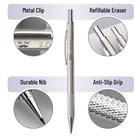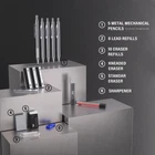 Introducing Mr. Pen metal mechanical pencil set, a versatile collection offering 5 distinct pencil sizes, ranging from 0.3 to 2.0 mm. Perfect for a wide range of writing and drawing needs. To ensure uninterrupted creativity, this set also includes a generous supply of 6 HB lead refills- no need to worry about running out of lead while you're in the zone. Mistakes happen, but fret not. We've included both a standard eraser and a kneaded eraser, along with 10 additional eraser refills, to correct any errors effortlessly. For those opting to use the 2.0 mm lead, a specialized sharpener is provided to maintain a fine point for precision work. To complete the experience, all items are elegantly packaged in a leather cover, offering both aesthetic appeal and functional utility. Introducing Mr. Pen metal mechanical pencil set, a versatile collection offering 5 distinct pencil sizes, ranging from 0.3 to 2.0 mm. Perfect for a wide range of writing and drawing needs. To ensure uninterrupted creativity, this set also includes a generous supply of 6 HB lead refills—no need to worry about running out of lead while you're in the zone. Mistakes happen, but fret not. We've included both a standard eraser and a kneaded eraser, along with 10 additional eraser refills, to correct any errors effortlessly. For those opting to use the 2.0 mm lead, a specialized sharpener is provided to maintain a fine point for precision work. To complete the experience, all items are elegantly packaged in a leather cover, offering both aesthetic appeal and functional utility.