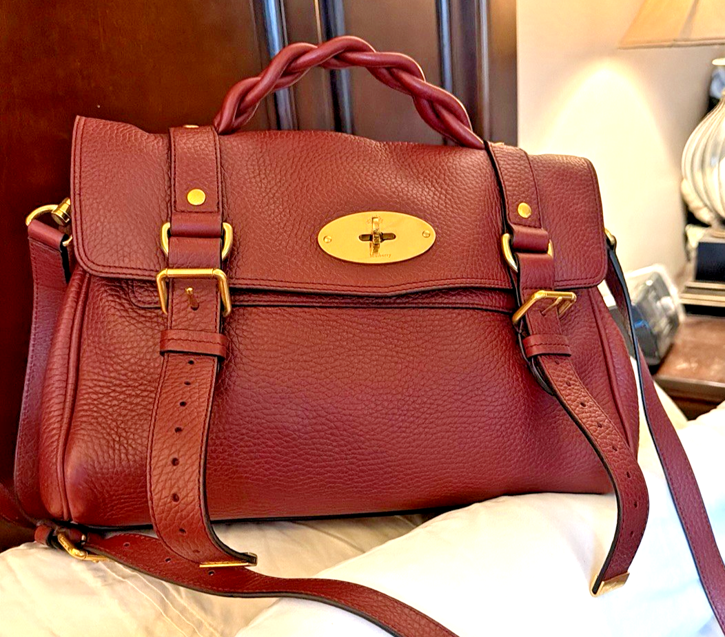The Mulberry Women's Leather Turn-Lock Alexa Crossbody Bag in Black Cherry with gold hardware is a stylish and versatile accessory for women. Made of high-quality leather with a solid pattern and turn-lock closure, this medium-sized bag features a braided top handle in smooth leather for easy carrying. The exterior leather and suede lining colors complement each other beautifully, while the gold hardware adds a touch of elegance. With a detachable strap and a classy buckle accent, this crossbody bag from the Mulberry Alexa collection is perfect for any occasion, whether you're heading to work or out for a night on the town. Made in the Turkey, this bag combines timeless design with superior craftsmanship. Style number KTK3 excellent condition.