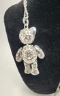 This product is a stylish necklace featuring a pendant in the shape of a bear, made of silver material with multicolor crystal cubic zirconia stones. The necklace is adorned with a chain style design and showcases a main stone of cubic zirconia. It is a fashionable and cute piece of jewelry that would make a great addition to any outfit, perfect for those who love teddy bears and enjoy unique accessories.