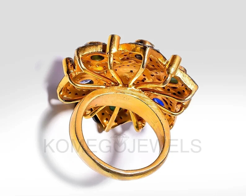 Multi Gemstone Umbrella Cocktail Ring with Natural Polki and Pave Diamonds