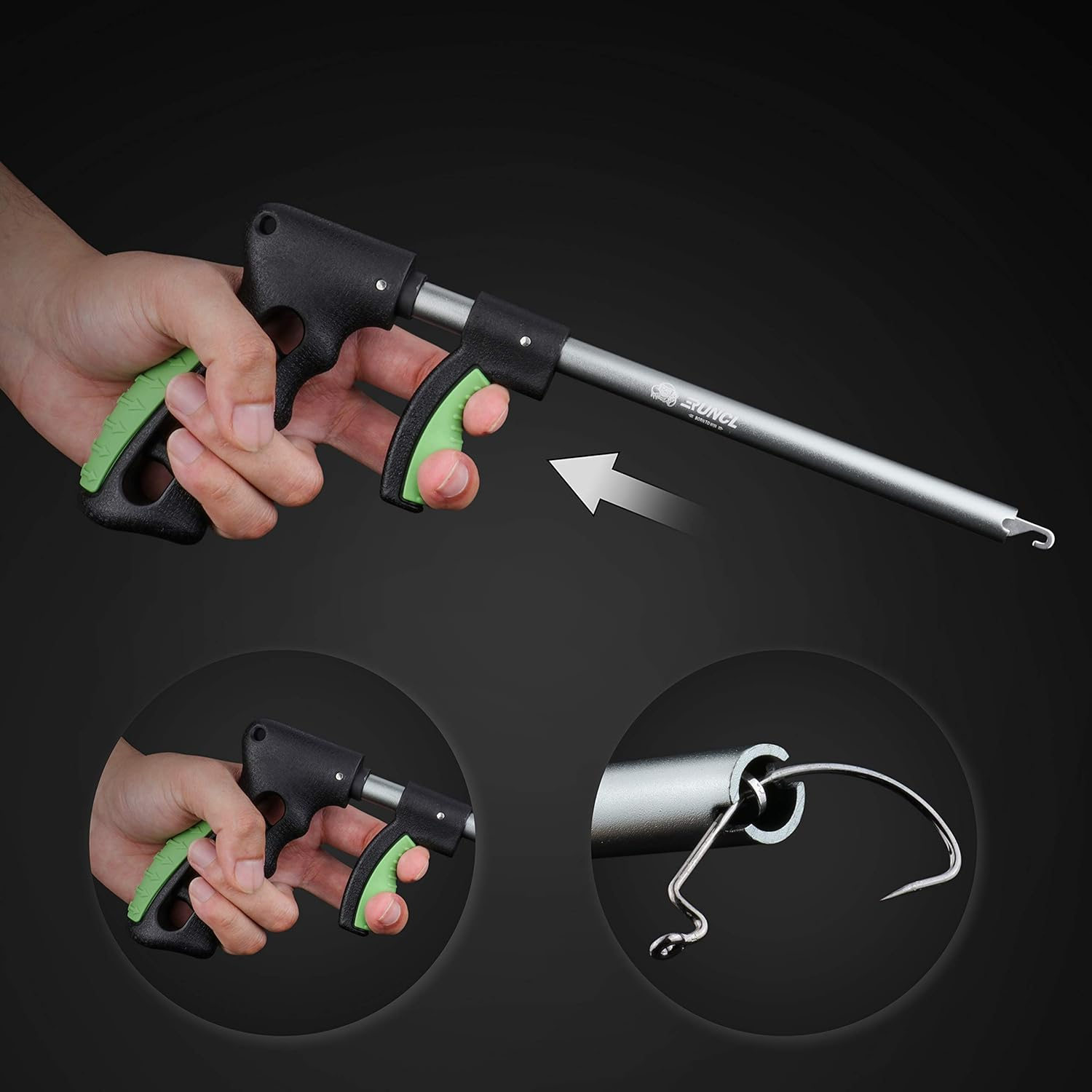 【10.6" Aluminum Alloy Long Nose Fish Hook Remover】: Our this fishing hook remover equipped with longer nose than needle nose pliers, can reach deep into the fish mouth, never worry about injury. The aluminum alloy tube is much more firm and durable than plastic ones. Size: Total Length: 10.6inch(27cm), Tube Length: 9inch(23cm) 【Squeeze Out Fish Hook Extractor】: The fishing hook extractor constructed with spring-loaded trigger handle, makes it more convenient to take off fishing hooks with only just one hand even in a wet or cold situation, easy to work with 【Stainless Steel Rounded Hook】: The removal hook is designed to be more rounded, less harm to fish mouth and fishing line. And there're two small groove on the tube opeing, help to fix the fish hook firmly and avoid slippage. Stainless steel material avoid rust and keeps a long last life time 【Widen Hollow Out ABS Handle】:Ergonomic design, features in widen handle with anti-slip rubber strips, offers a solid grip even with wet hands; the hollow-out handle made of high strength ABS significantly reduces the weight without sacrificing strength and durability 【Fish Hook Remover Saltwater】: This fish hook remover tool especially made of aluminum alloy tube and stainless steel hook material, which can provides high durability and strong bite force, delivers corrosion resistance in saltwater environment Product Description Multi-Function Jaws The fishing plier can be used to grab and remove any fish hook, to cinch down a knot quickly and safely, available in both a straight nose and a Split-ring nose design. Effort Saving Design The fishing plier with unique handle design, with TPR material patch, which is comfortable to touch and easy to control. No Lost Design With the Included nylon sheath, PVC coated wire coiled lanyard, aluminum carabiner, and belt loop, you don't need to worry about losing. Nice Gift The fishing plier kit is a nice gift for fishing lover, father, brother, husband, and etc!