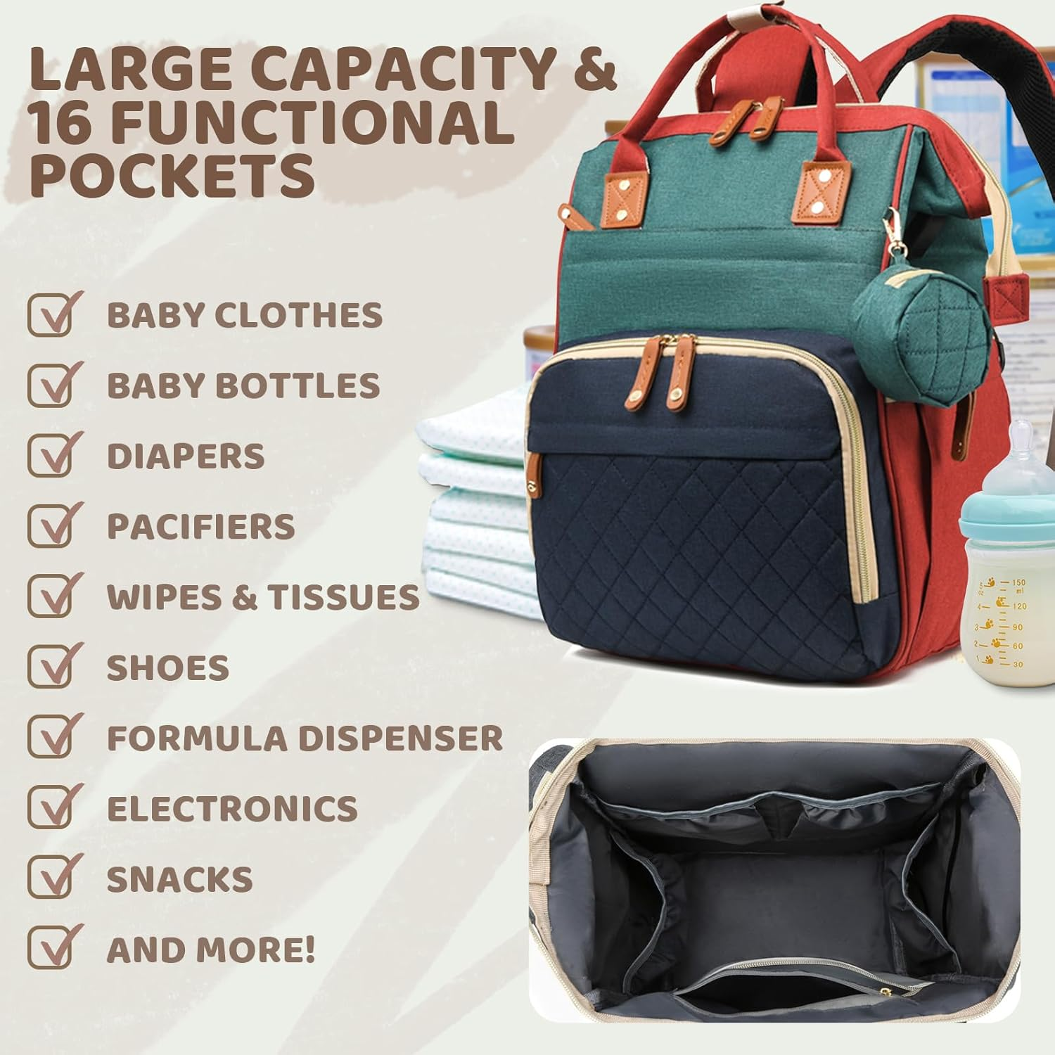 【Spacious Design for All Baby Essentials】Our diaper bag backpack offers an extra-large capacity to store everything you and your baby need for a day out. From bottles, diapers, and wipes to toys and clothes, this baby bag keeps everything organized and within reach, making it a top choice for parents on the go. You'll love the pañaleras para bebe niña or pañaleras para bebe niño. 【Premium Changing Pad Included】Each bag also includes a premium-quality waterproof changing pad, adding convenience for diaper changes on the go. 【16 Multi-functional Pockets】Designed with busy parents in mind, this diaper backpack features 16 versatile pockets to help keep your baby's essentials well-organized. With dedicated pockets for bottles, wipes, diapers, and personal items, it's easier than ever to stay organized. This is the perfect baby bag for mom who needs to access items quickly and efficiently. 【Multi Colors to Choose】Available in 7 trendy colors, this backpack diaper bag caters to both boys and girls, making it ideal for those looking for diaper bags for baby girl or baby boy diaper bags. 【Convenient for Travel】Equipped with sturdy stroller hooks, this baby backpack makes it easy to attach to your stroller, giving you hands-free convenience during outings. 【Comfortable to Use】The padded shoulder straps provide extra comfort, ensuring that carrying your baby bag is as easy as possible, whether you're on a quick errand or a longer trip. Product Description